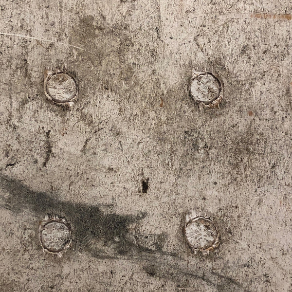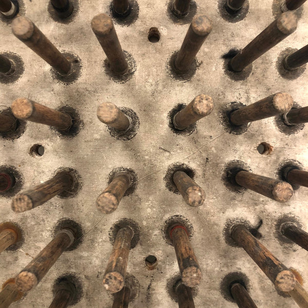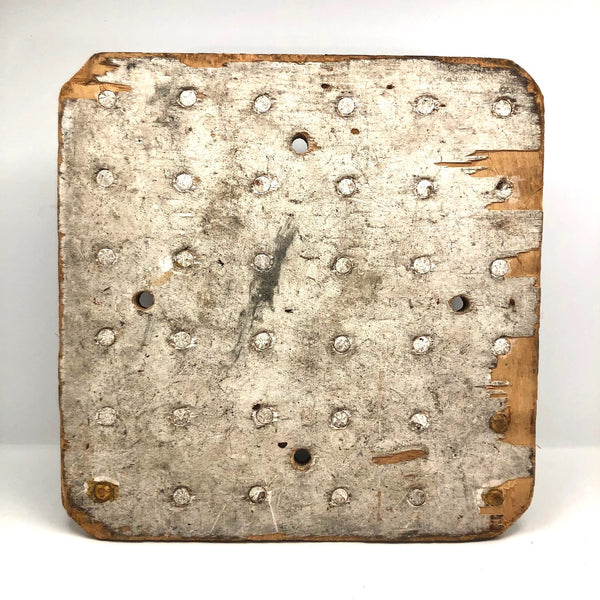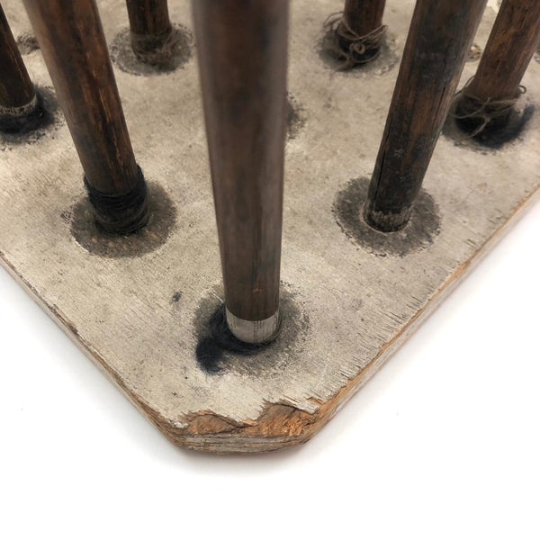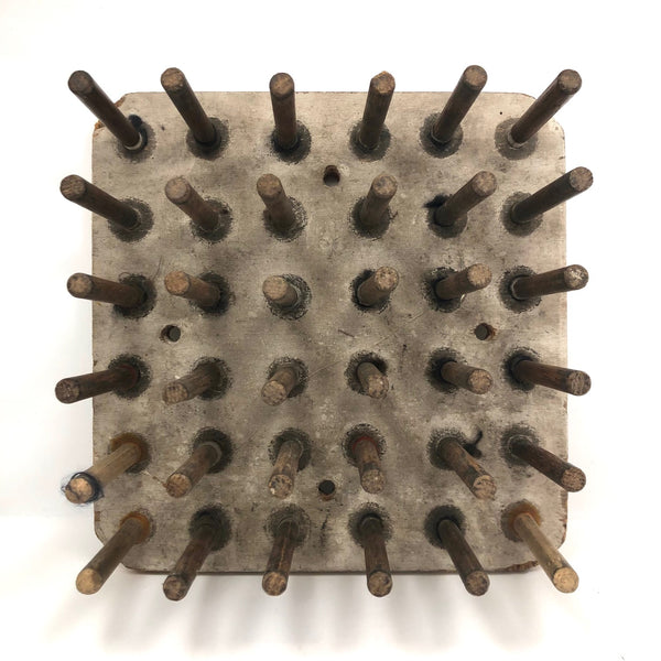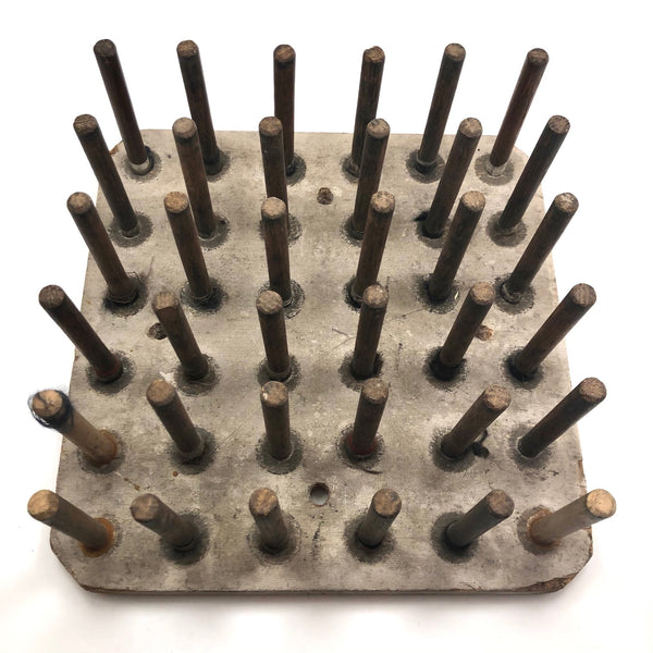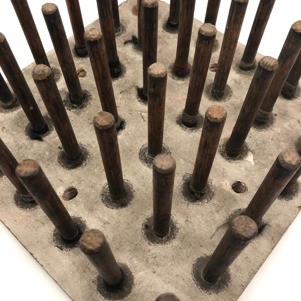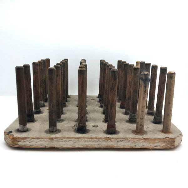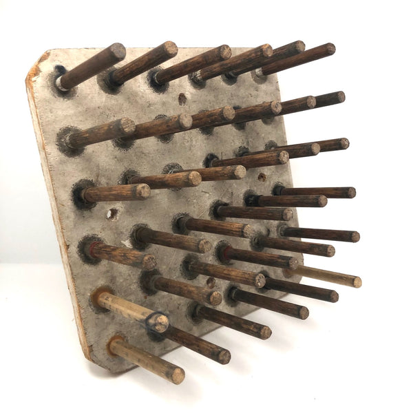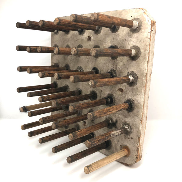 From what I understand, this came from an old New England mill, and I'd guess would have been mounted on the wall, holding large spools of thread. And indeed, at the bases of most of the wooden dowels some threads remain, mostly wool from what I can tell. I just think it's a great object, and could be put to all sorts of creative and pragmatic uses. The board itself shows old white paint on front and back, while the dowels are unpainted. There are four holes--one at the center of each side--for mounting to the wall.
