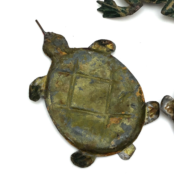 Frog approx 2 1/2" l; turles approx 2 7/8" (including pins extending from their mouths!) Wear and age and some flattering, making them all the more endearing in my opinion.