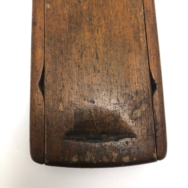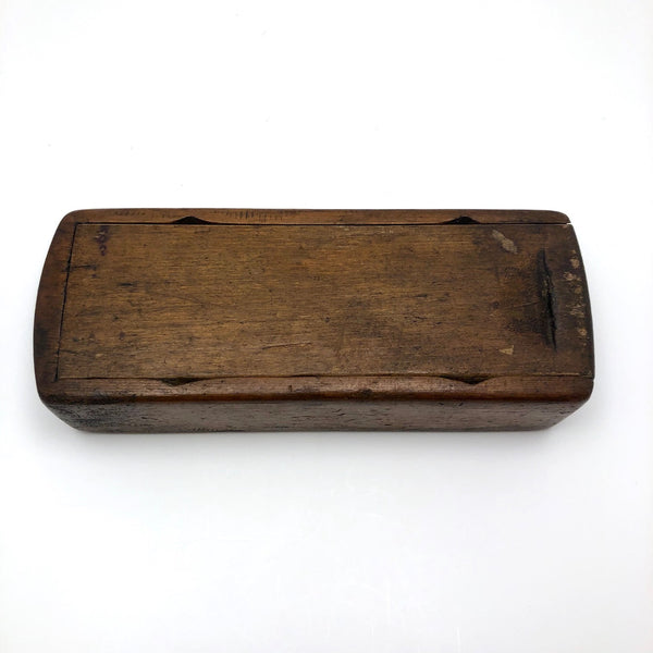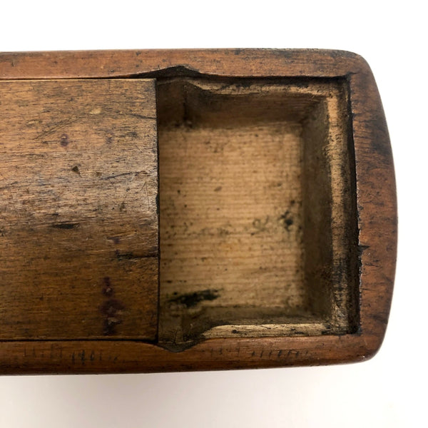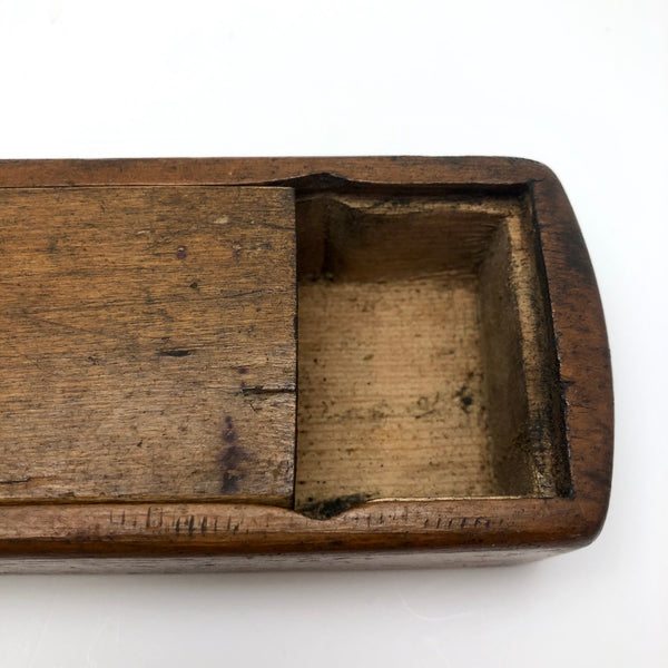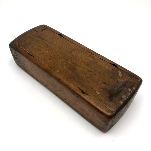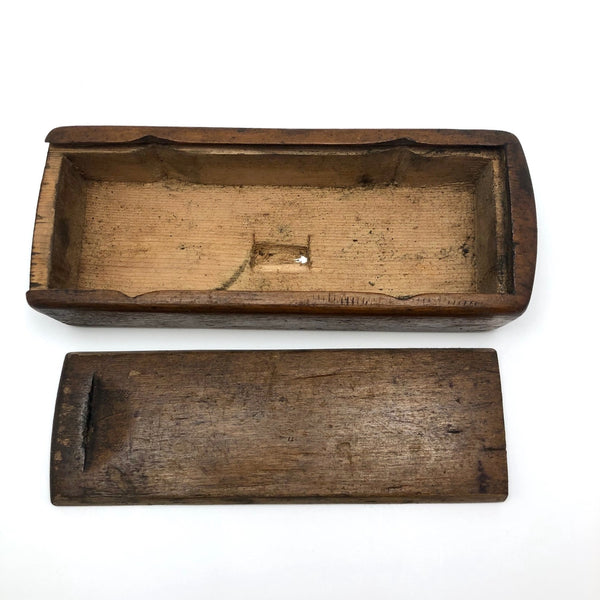 Photos don't come close to doing justice to this beautiful, very old carved slide top box; it is just gorgeous. The bottom half is entirely carved from one piece of wood, no joints, with two pairs of lovely carved notches along the edges of the rail on the top, into which the sliding lid fits perfectly, nice and tight. The patina on this one a beautiful thing, warm and radiant, with edges and old scratches softened and smoothed from wear.