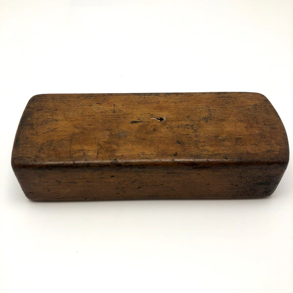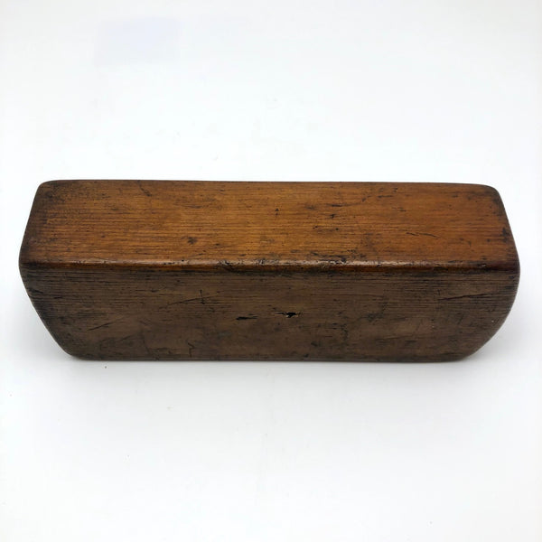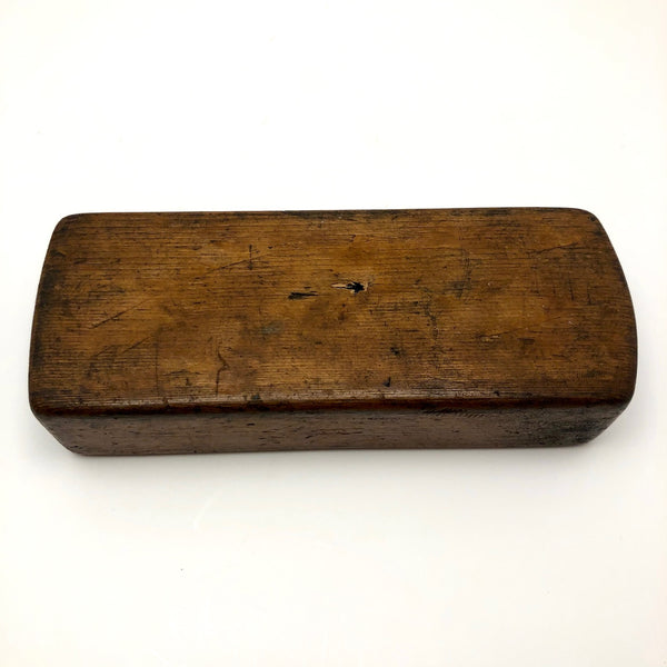 6" l x 2 1/4" wide x 1 1/2" and in perfectly imperfect antique condition. There are a couple of tiny holes in the bottom; not sure if product of a small cut at some point or just worn through with age.