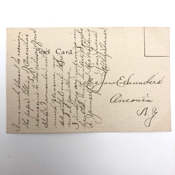 Addressed to Mrs,. Jane Saunders in Oneonta, NY, the back reads: " I was much pleased to receive the paper telling of Quenta's (?) admission to the cities of our state. I remember with much pleasure my delightful visit there and at your home, I trust you are improving in health. With kind regards to yourself and Mrs. Watkins. Your friend, Kathryn Turner.
