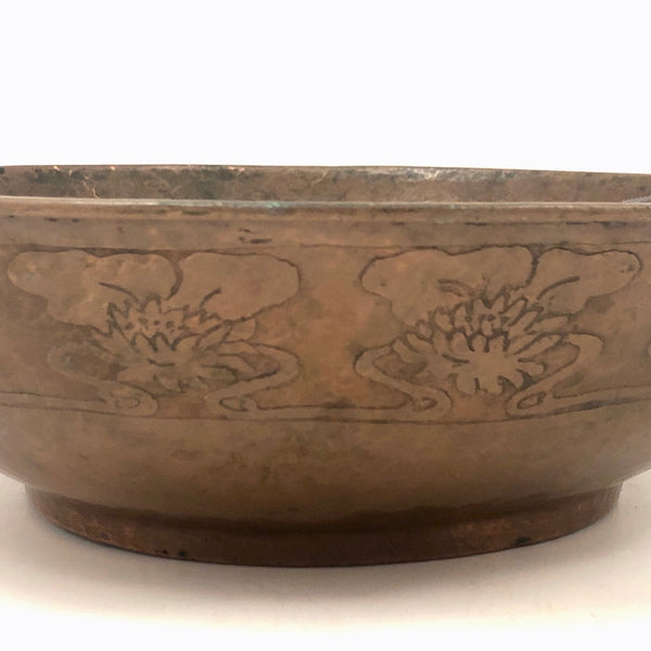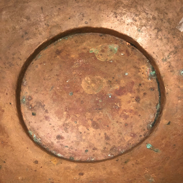 10 1/8" in diameter x 3" tall and in very good condition with a nice patina to the copper. A bit of greening to the interior, and a bit of irregularity to the form (just off round), all to the good I think. No mark on it that I can see. (There is a piece of tape on the interior of the bowl in one photo, since removed.)