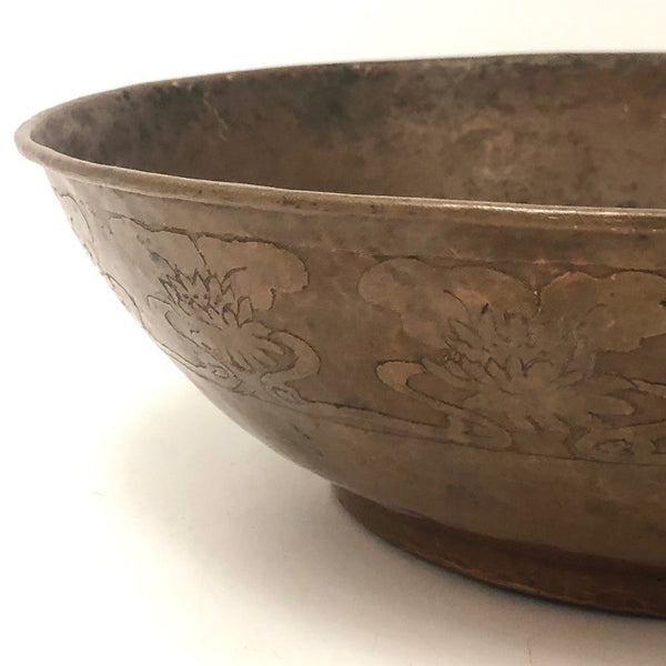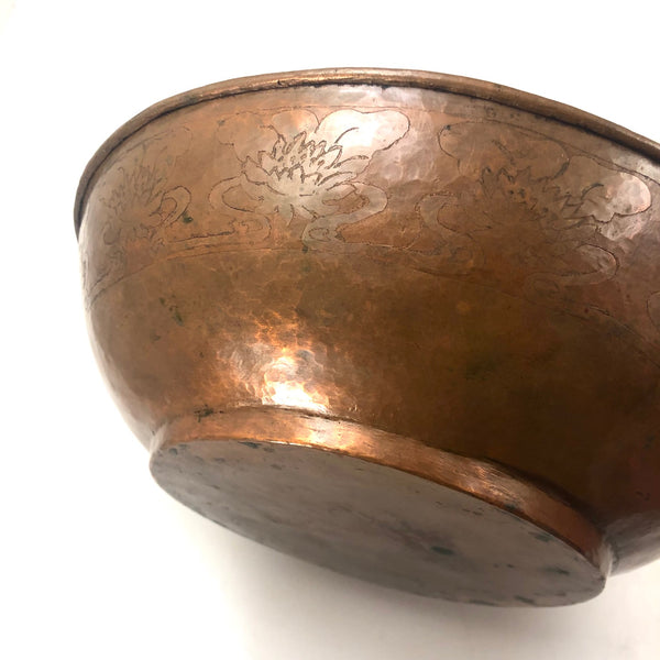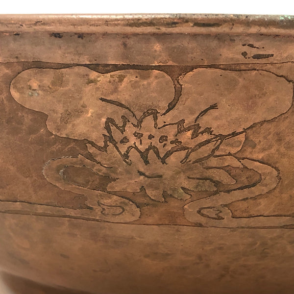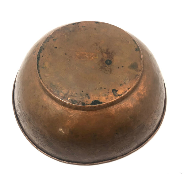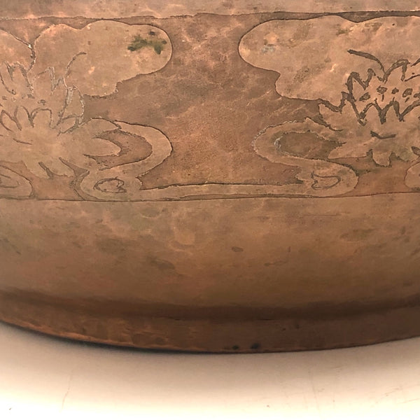 Maybe not exactly my usual thing, but I'd put hand-hammered copper in the a similar category to matte green glazed art pottery--classic, but with lots of character, and this bowl, as well as those bowls, I'd describe as Arts and Crafts. The hand-done decoration around the exterior (etched/engraved it looks to me) is certainly Arts and Crafts in style, but looks to me somewhat like a folk art iteration of it, which makes me like it all the more. 1920s or so American I would think and much lovelier than my photos convey.