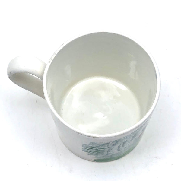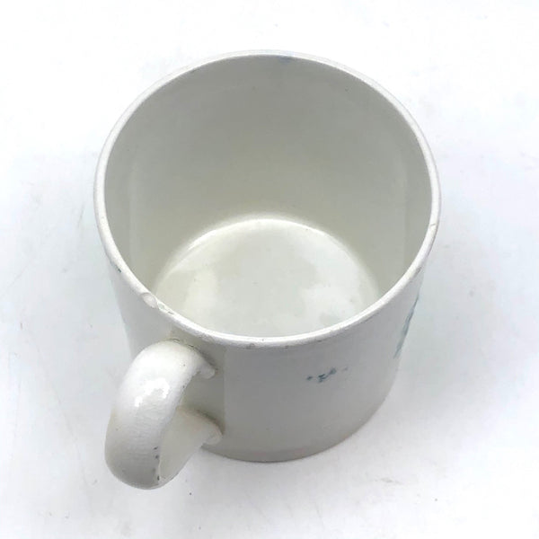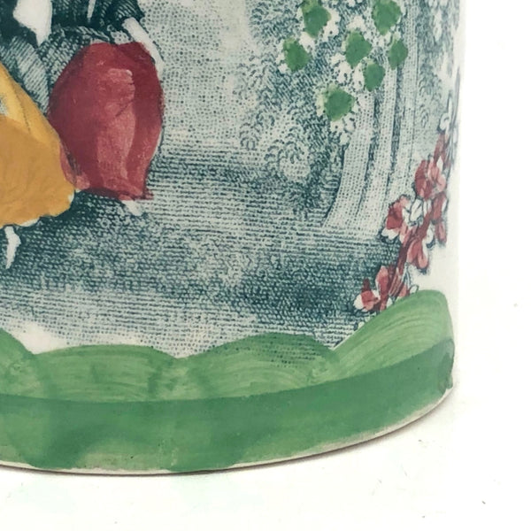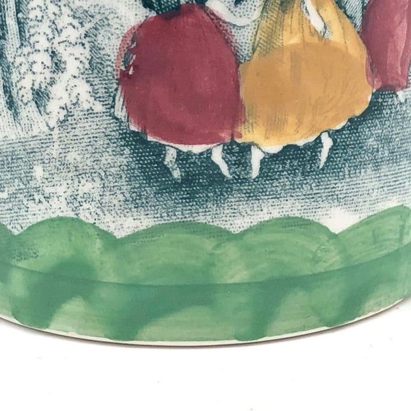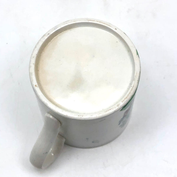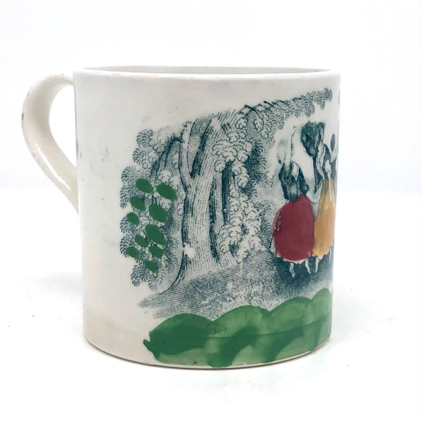 I've seen a close match of this child's cup described as Staffordshire, but I'm not totally sure; certainly it is antique English, with hand-painted decoration for the skirts of the dancing girls, flowers, leaves and grass, in addition to darker green transfer. And as is typically the case, the transfer is not perfect, with a bit of a smear between the face and raised hand of one girl, which makes it appear as if she is trying to see through a cloud of fog, which I quite like!