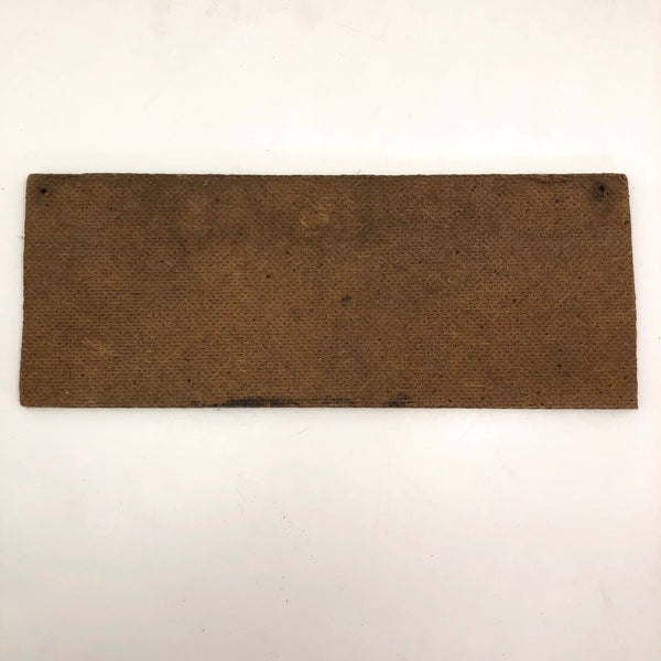 9 3/4" long x 3 3/4" tall x 3/16" thick. Well worn but in great shape structurally, with two holes in the top corners for hanging.
