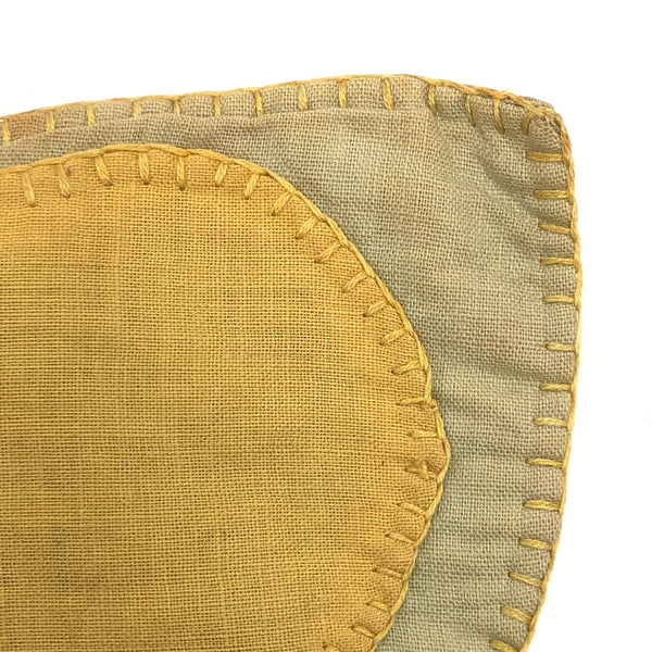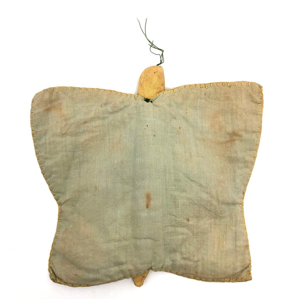 6" l x 6 1/4" wide with wings spread; 1/2" thick. A few stains on the backside but overall very good condition, with no lost or loose stitches that I can see.