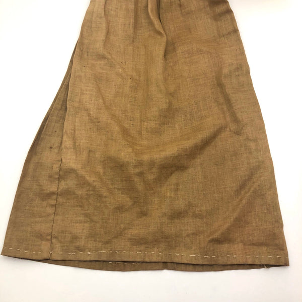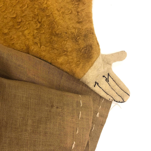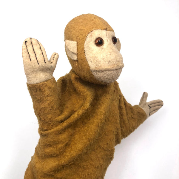 I'm a total sucker for a good puppet, especially a one of a kind handmade one, and this is definitely on of my favorites I've found. Very well constructed, the head and upper body are of good quality felt, with black stitching for the fingers of the terrific little hands. And then this wonderful long and flowy brown linen skirt, long enough to conceal your entire arm! A tube inside at the neck allows a finger or two inside to animate this endearing creature, while placing the far fingers in the hands. Really a good one!