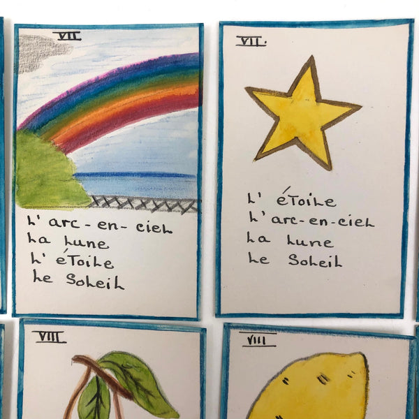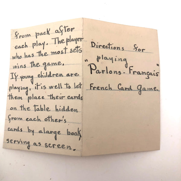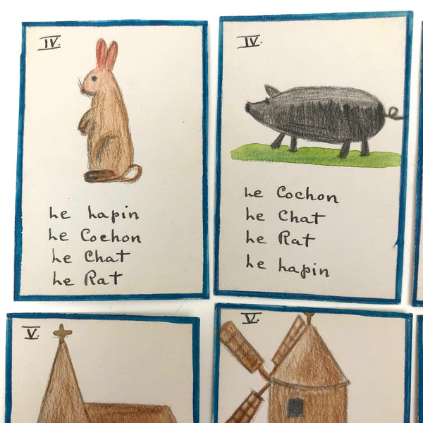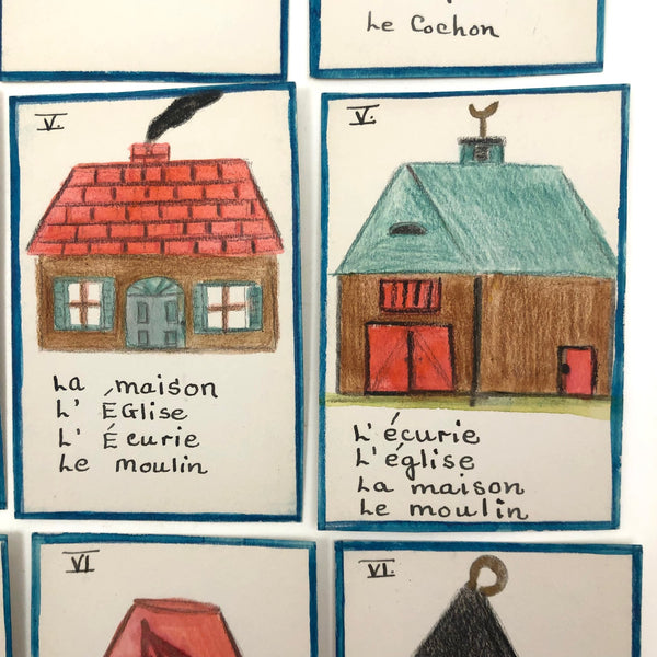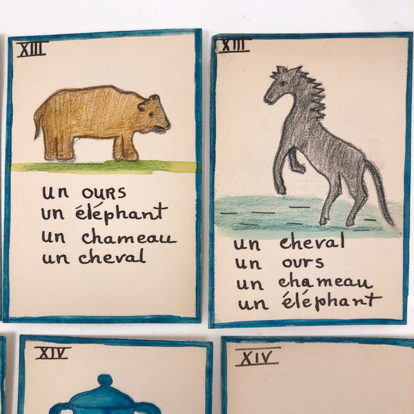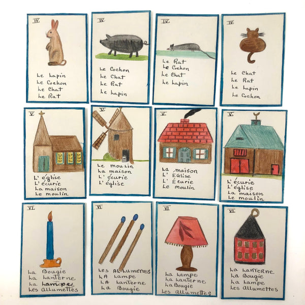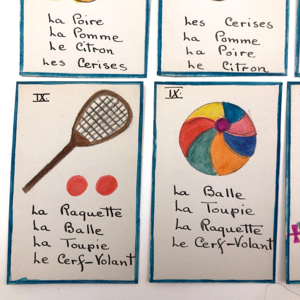 The existence of things like this hand-drawn deck of cards--made I would guess by a mother, though perhaps a French teacher, intent on teaching French vocabulary to her children--makes me very happy. The game is basically rummy, where one wants to acquire all of the cards of any given set, while learning the names of fruits and vegetables and animals and games and vessels in the process! The cards are a nice weight card stock, and the drawings done in some combination of colored pencil, ink, marker and/or watercolor. Surely a one of a kind set, and most certainly a labor of love!