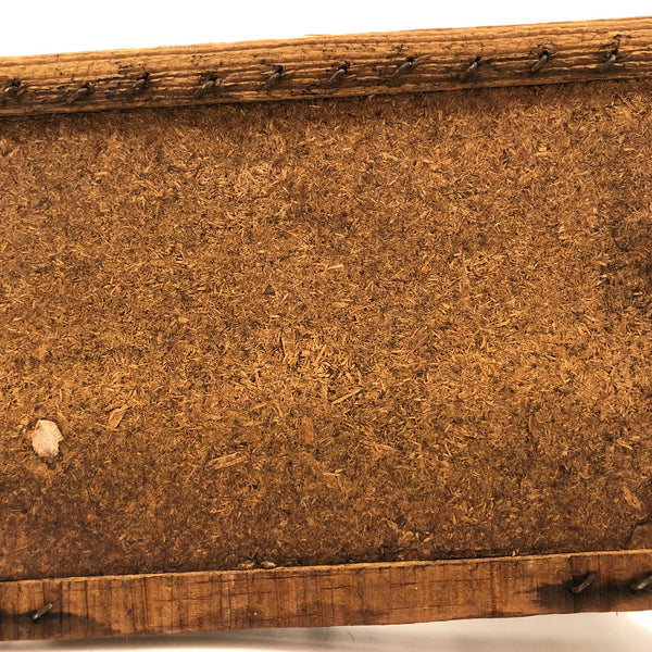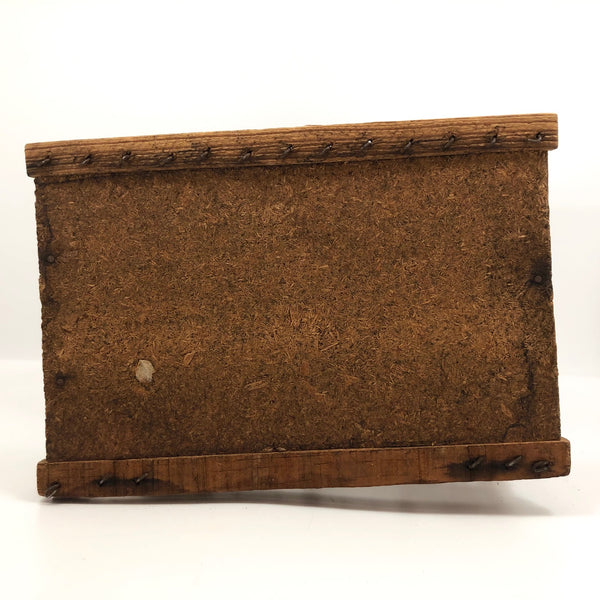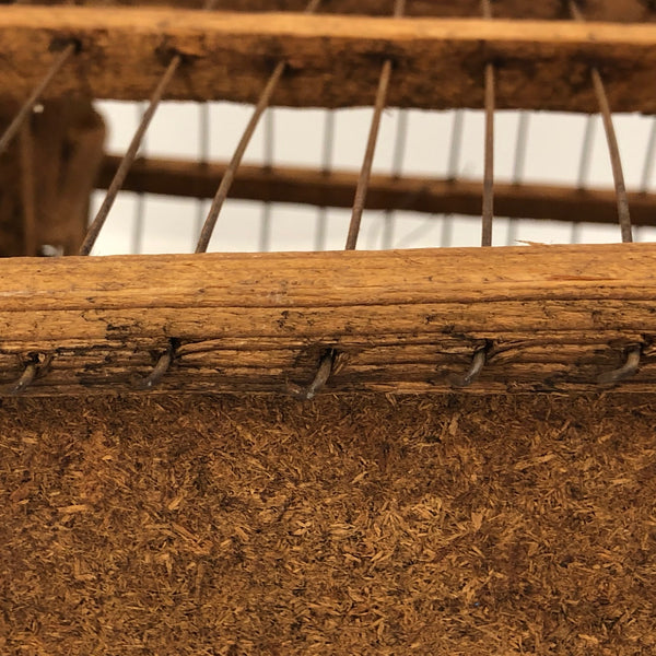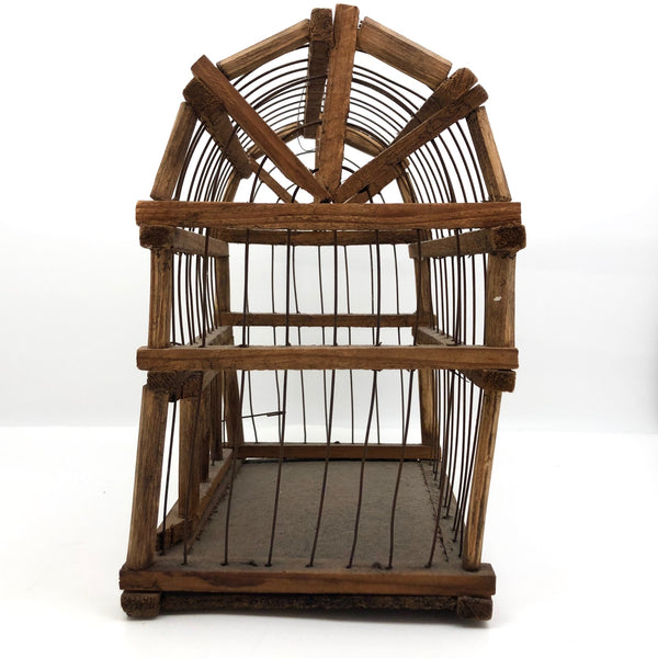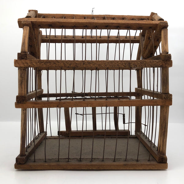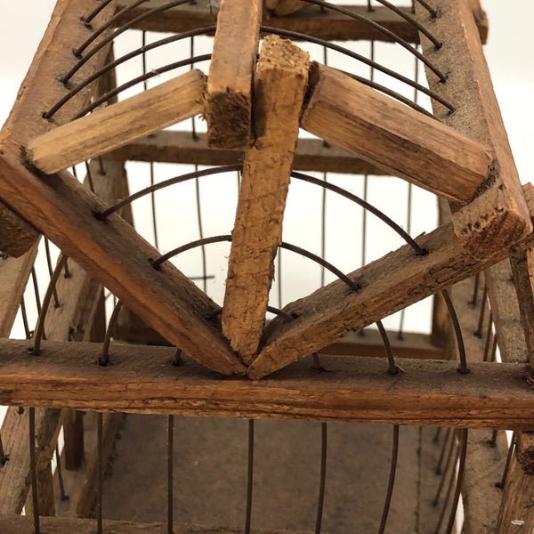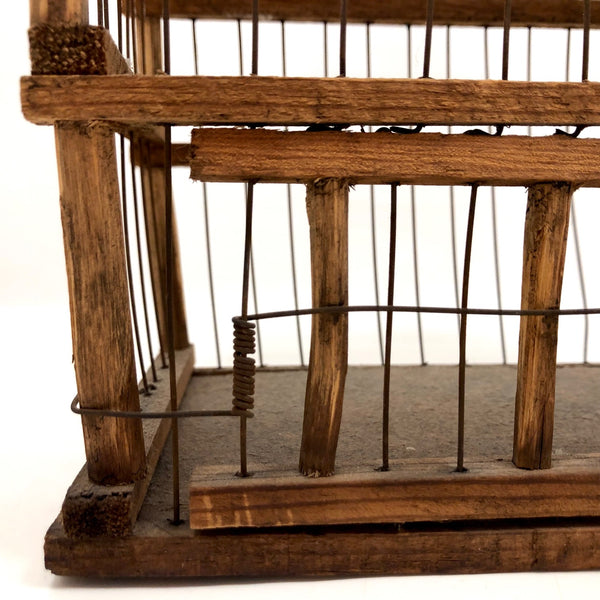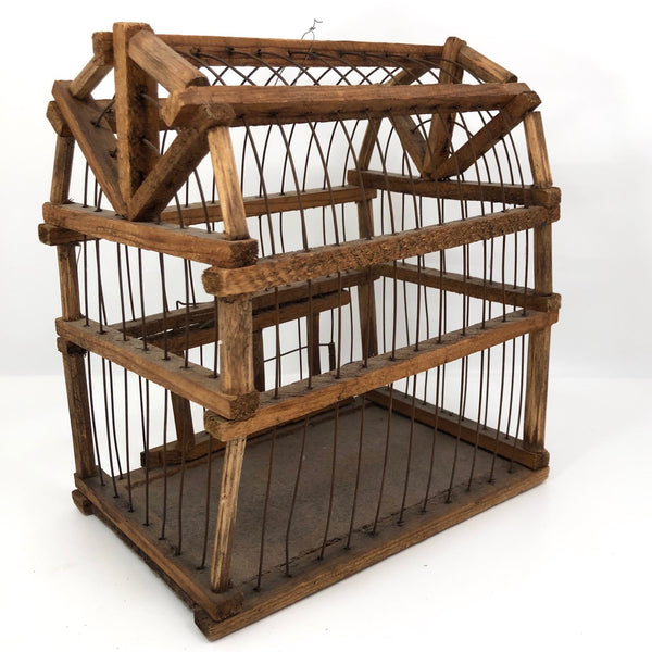 This wonderful old barn-shaped wood and wire bird cage was clearly made with a lot of love and care, and it is wonderfully wonky, with no right angles to be found! To me it's like a three-dimensional drawing, a beautiful interplay of lines in space. My favorite thing about it, though, may be its tension-mounted door, which takes a strong pull to open, then closes with a very satisfying thwack! Definitely this could still be used to house a little bird, but would also be great filled with a plant or two, or just hung and enjoyed as the fabulous sculptural object that it is.