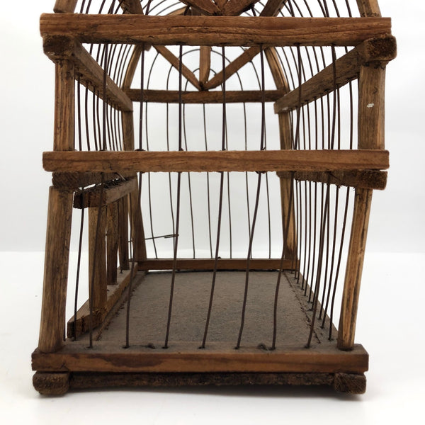 Based on one similar that I have found, I believe this birdcage dates from the 1930s or so. It measures 8 1/2" tall x 7 3/4" long x 5 1/2" wide and in great vintage condition.