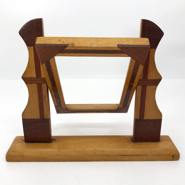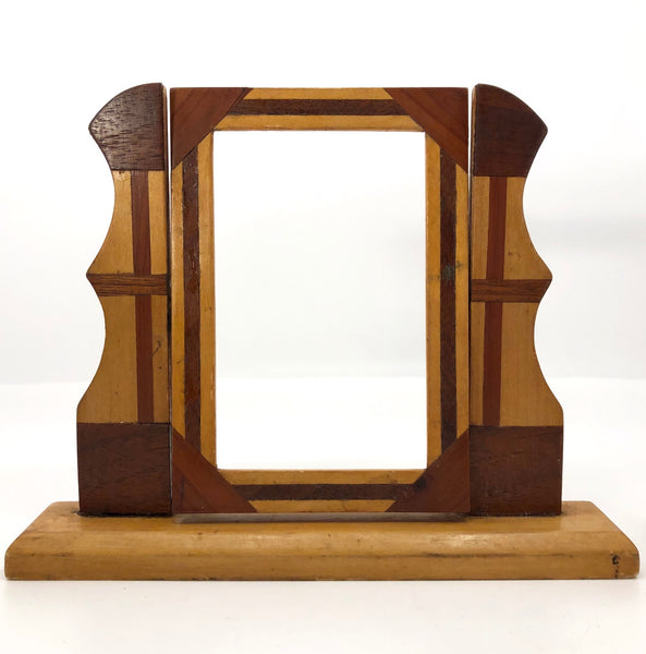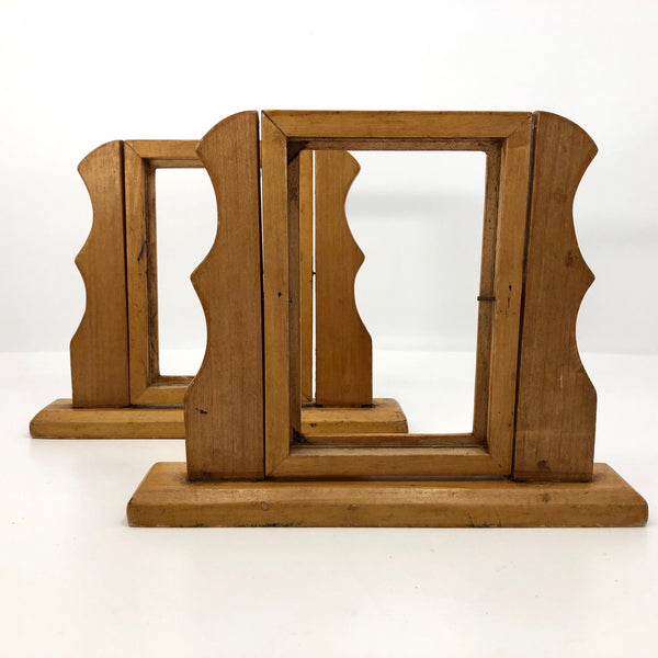 I think this pair of wooden tabletop frames are just the right mix of elegant and crafty--not over the top, but still with the hand and sensibility of the maker wonderfully present. Made of three different types of wood, they're in very good shape, just missing glass panes, which for a few dollars could easily be cut to fit into their 3x4.5" openings...and there are still a couple of nails on the back side to help hold them in place. Perfect for displaying portraits of one's favorite relatives or pets...or giving pride of place to any photo at all! Really striking!