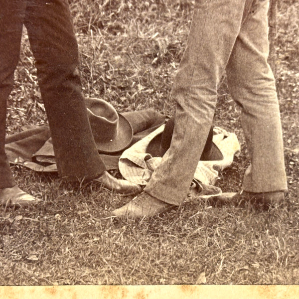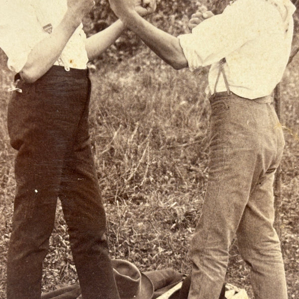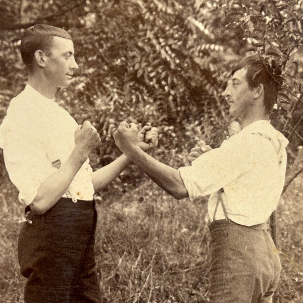 I just can't say no to a handsome young pair of boxers in the backyard--actual boxers or just dukes-up posers, as I believe is likely the case here. With their hats and coats laid neatly on the ground just behind them.