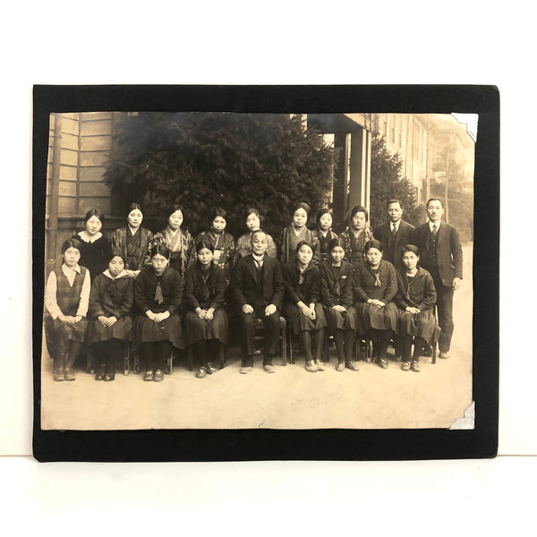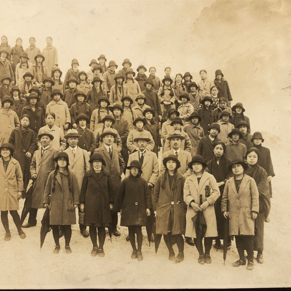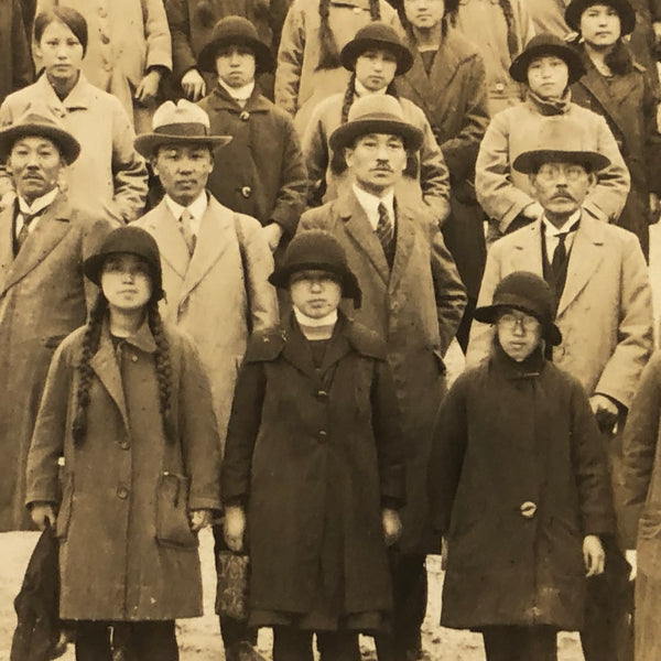 A very beautiful image I think, though I don't know what all of these men and mostly young women were gathered for--in their coats and hats with umbrellas in hand, though, they were clearly prepared to be out in the elements. What a field of faces, captured in their beautiful singularity and yet so much appearing of a unified whole, as if in uniform, and with long pigtail braids hanging past the shoulders of almost every young woman. Looking rather as if the've just emerged en masse through dense fog, with the lack of specificity of place making it all the more striking and atmospheric. And on reverse, another photograph, a school portrait I presume, with half the young women in school uniforms and the other half in kimono.