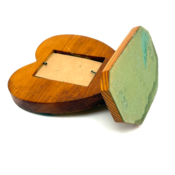 6" wide (heart itself); base is 5 1/2" w x 3 5/8" d. Opening of frame approx 3 3/8" x 2 1/4". All in very good, crisp and sharp looking condition. Cardboard backing behind glass in frame--ready to use.