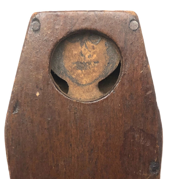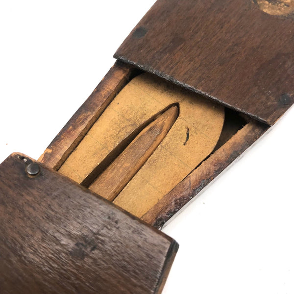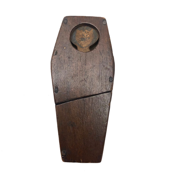 I've had a few of these coffin-encased carved figures with pop up phalluses over time, which are always fun, and which I especially appreciate for the differences among them. I've not seen another like this one, with carved out window on the front of the coffin revealing the face of the figure--and the face, with graphite features, looks to me more like that of a woman than a man, which makes the reveal all the better! It's also a bit unusual in that the figure is permanently encased; only the lower half of the box opens, sliding like the lid of a puzzle box, while the top half is entirely nailed shut.  Quite a nicely shaped and constructed coffin too!