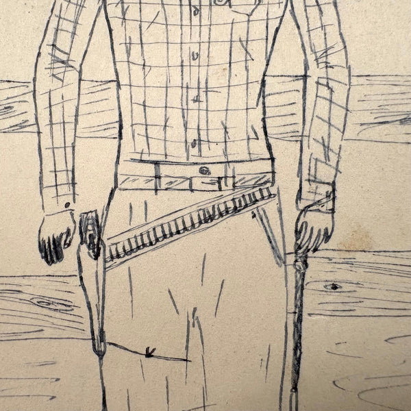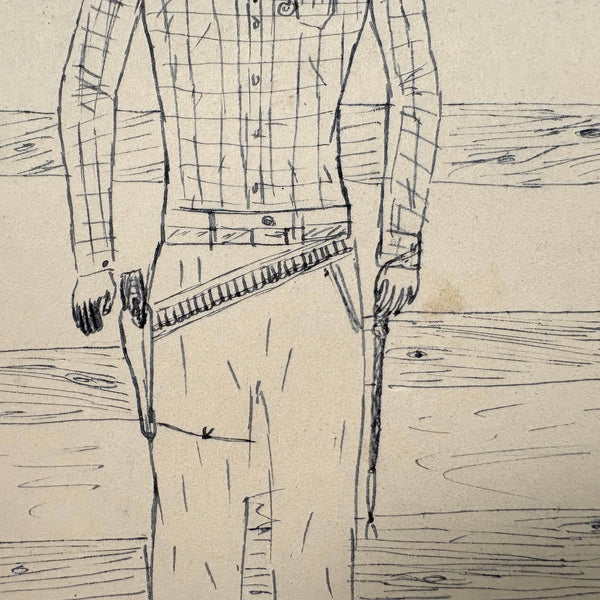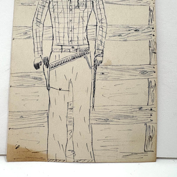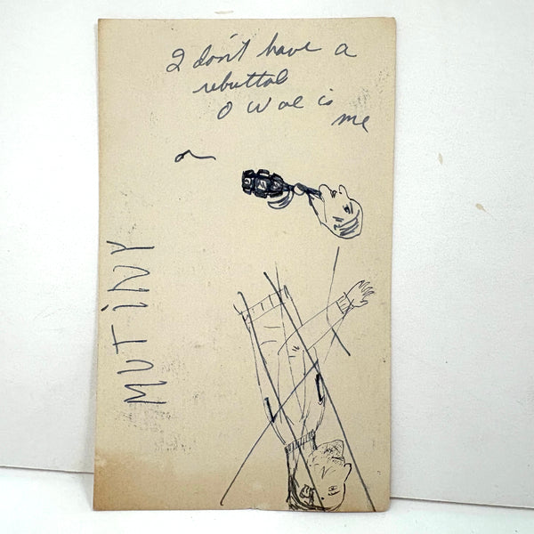 Feels super classic to me--and of the perfect sort of hang alongside one's carved toy gun collection. And I love the conversation between the portrait of this cowboy/outlaw and the reverse side, with the phrase "I don't have a rebuttal, woe is me," suggesting a very one-sided shoot out, and MUTINY in capital letters running down the side.