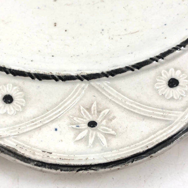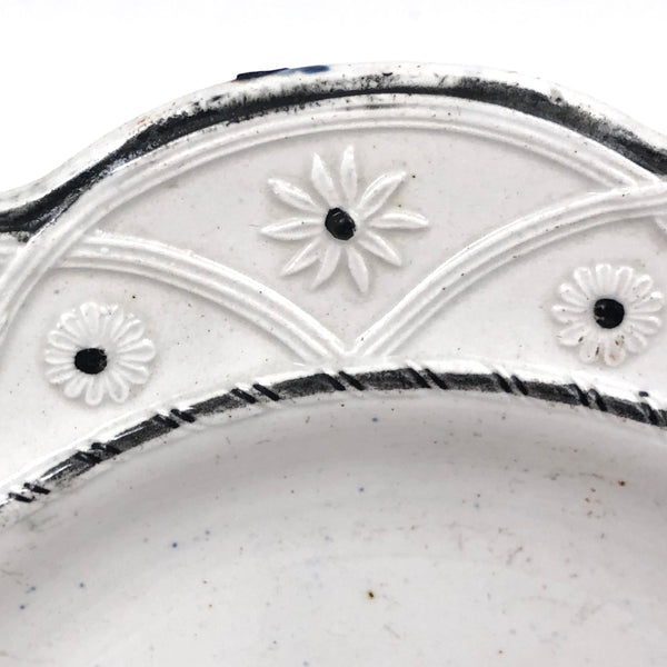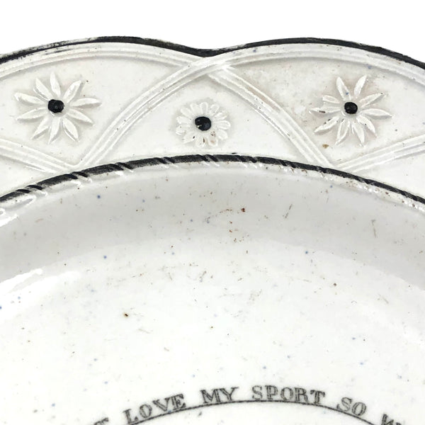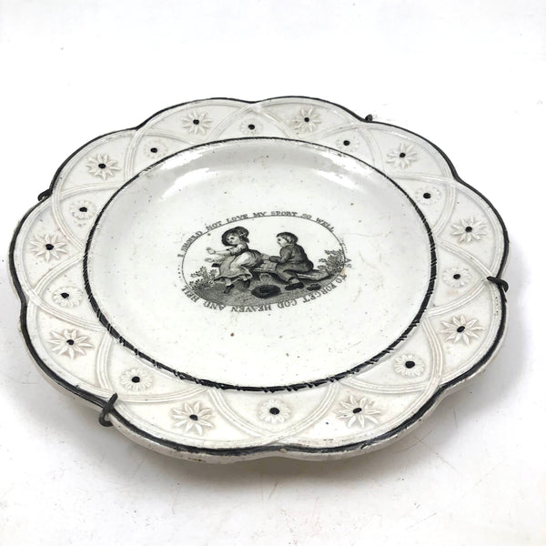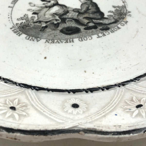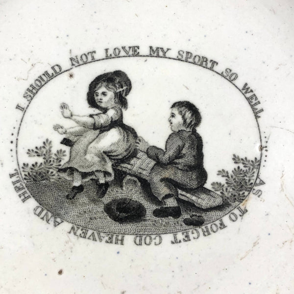 You know I have a thing for early British pearlware/transferware motto plates, but this is by far the most beautiful I've seen (the border, with raised flowers and black painted details is just stunning) and it's quite an early and scarce one. I also love it for the use of the now fairly achaic use of the word "sport"--here meaning diversion/fun, here taking the form of our girl perched at the high end of what looks to be seesaw, all the while reminding herself to keep "God, Heaven and Hell" in mind!
