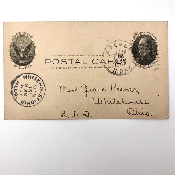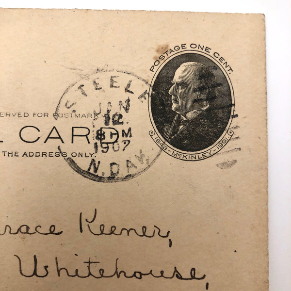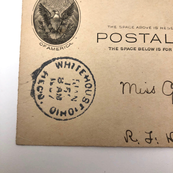 This may be my favorite old hand-drawn postcard yet, with this wonderful leaping Dutch boy in the perfect blue and orange outfit, in such a hurry to convey his love that he's missing a striped sock! Plus an apostrophe on the Your's for emphasis! One would guess this is meant to be Taylor himself, who sent the card to a Miss Grace Keener in Whitehouse, Ohio in 1907. Pretty great.