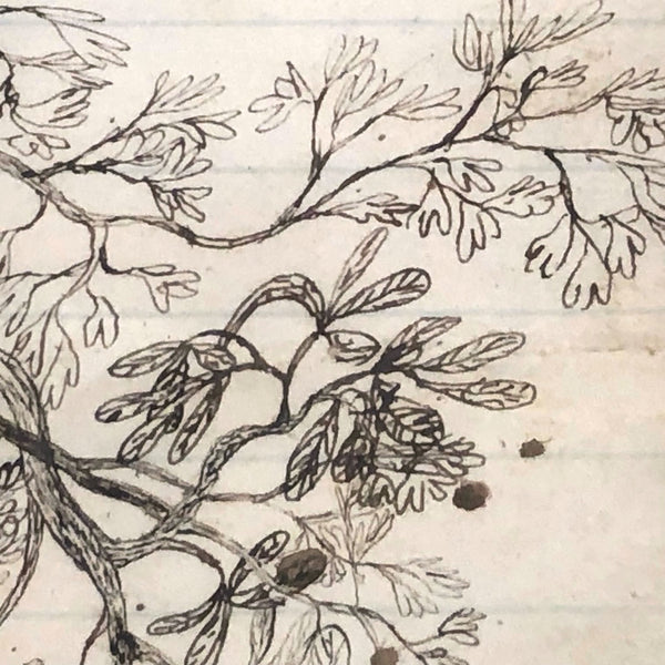 A perfect 19th birthday present if I ever saw one--though also for anyone who can remember being nineteen, in my case very distantly! One certainly wonders what all happened that year in the life of the Frank Ellis who drew this in 1864--during the Civil War, with the arching stalks and capillary-like branches of what I take for boughs of a fruit tree having a bit of the mournful quality of a weeping willow. But, yet, a pot of blooming flowers right at the center--and indeed one hopes Ellis made it to see his 20th year.  I find it quite a special feeling thing, and in a very nice, roughly period frame--grain painted with silver interior edge.