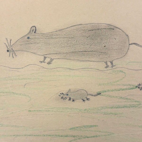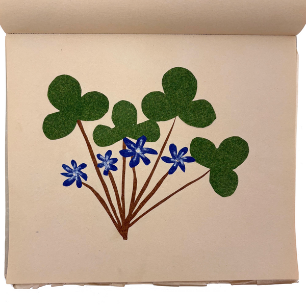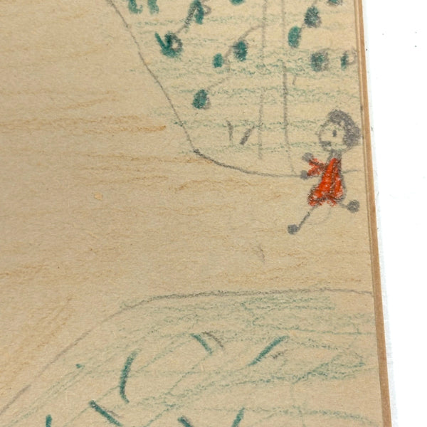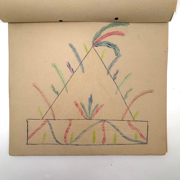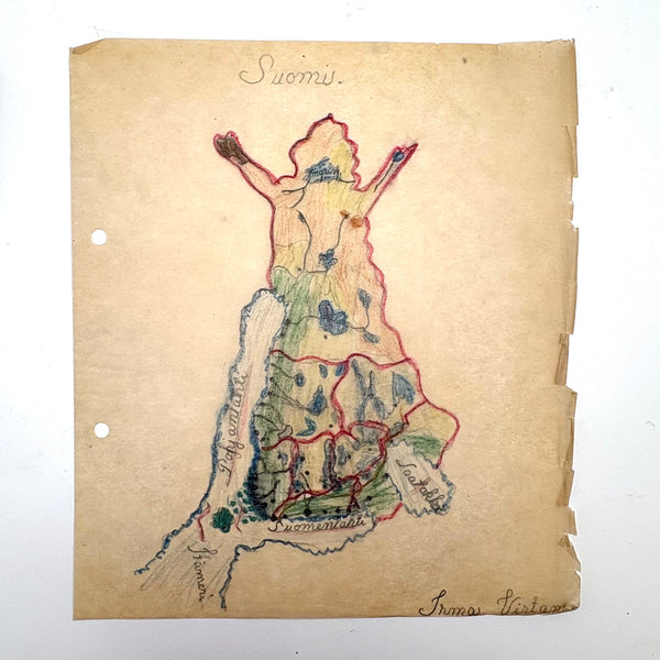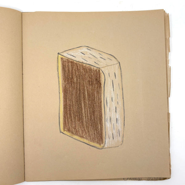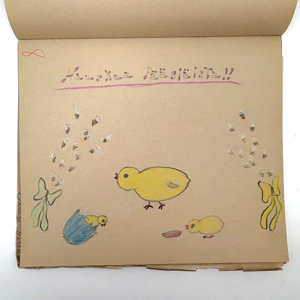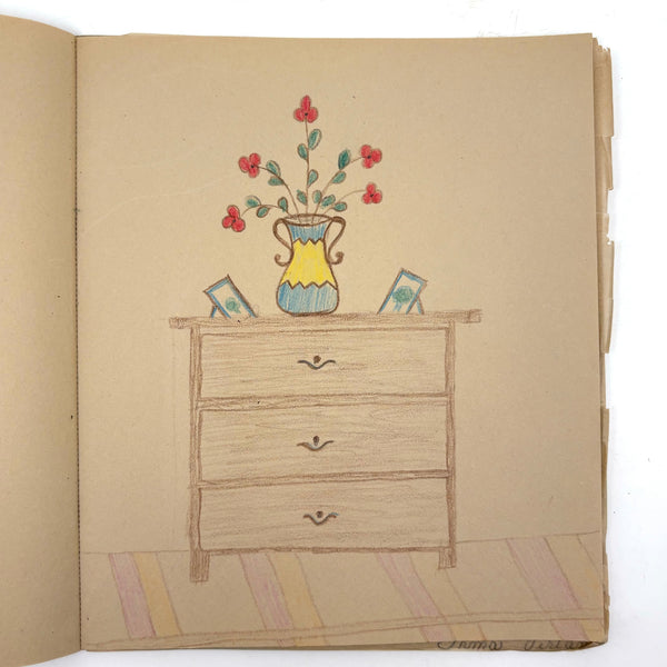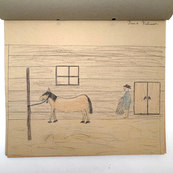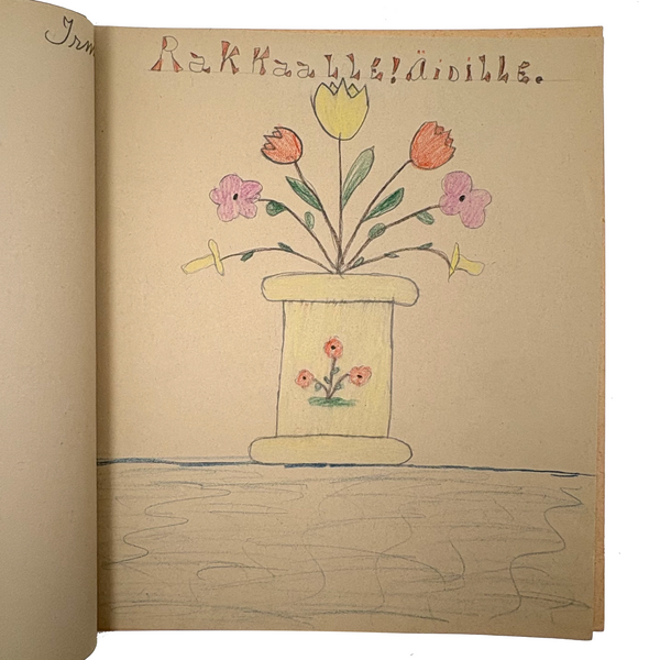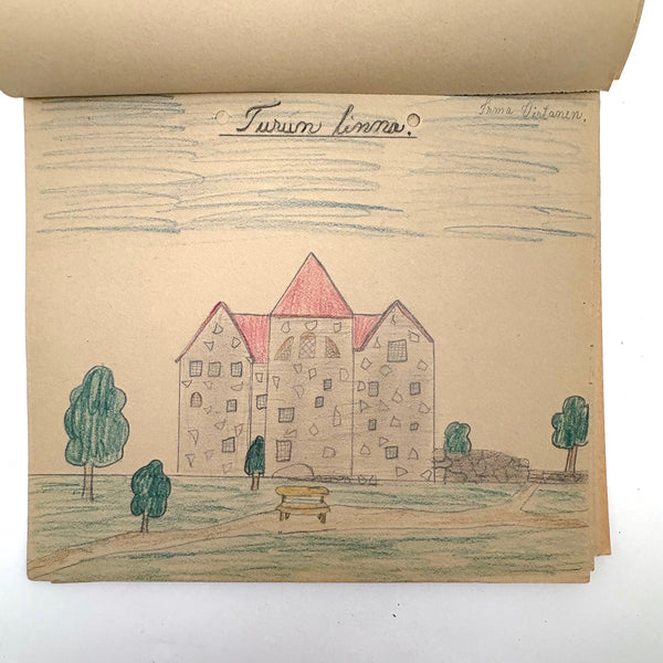 Quite a charmer this sketchbook, full of crayon drawings by a young Irma Virtanem of Finland,  c. 1920s-40s I believe. The mother mouse surrounded by baby mice may be my favorite, but the rainbow colored sun rising over a native woman with skis in hand is my favorite too! And lots of other good ones--clocks and vases of flowers and Turra Linna (Turku Castle) and houses and gardens and horse barns and more. Plus what looks like an ice cream sandwich!? Very sweet.