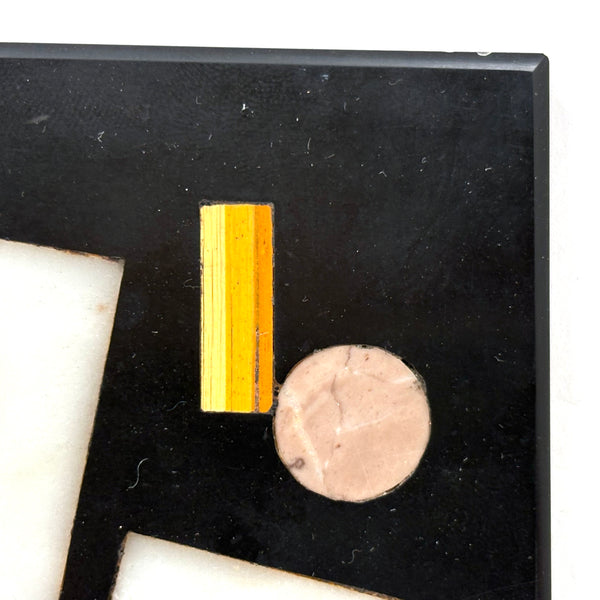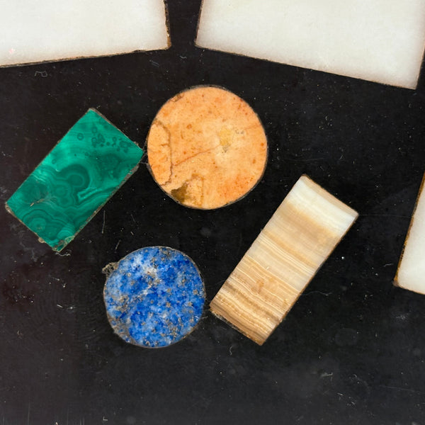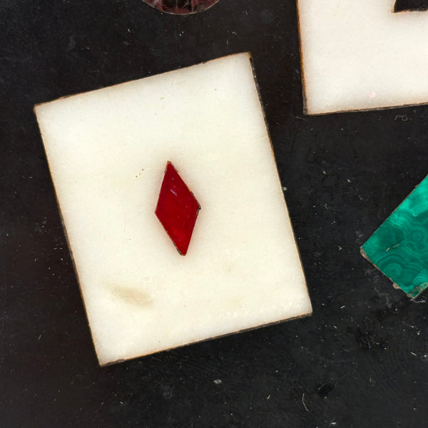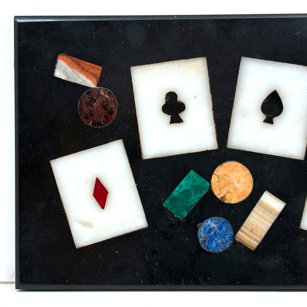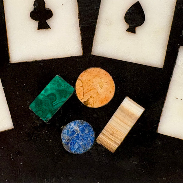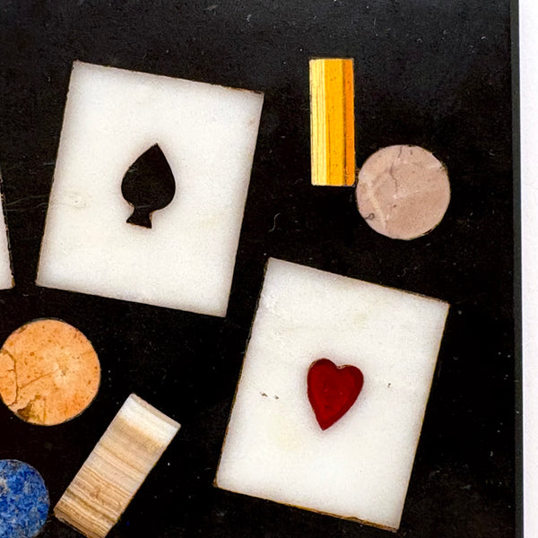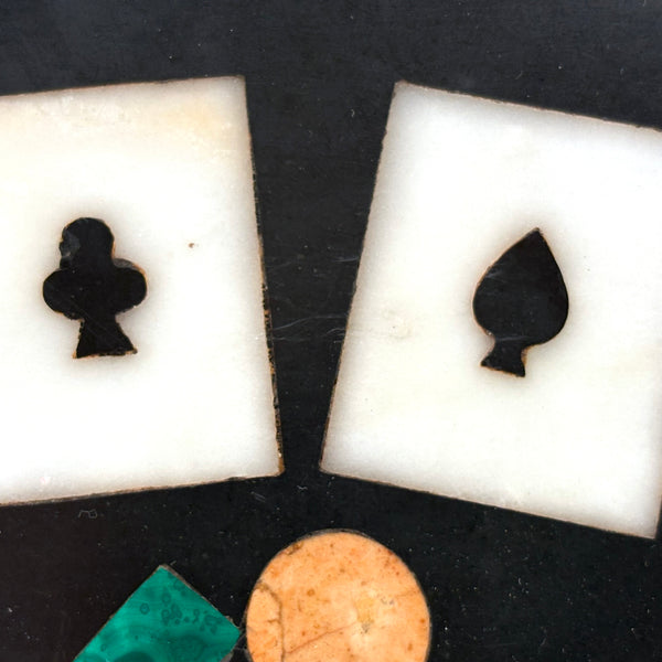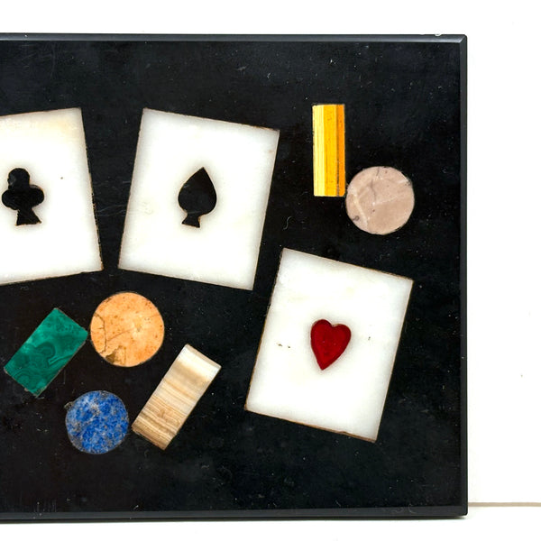 I believe this Italian pietra dura (hard stone marquetry) panel was once inset into the lid of a brass or wood playing card box (one can find a range of examples out there with a quick search), but I was quite happy to find it on its own and would be inclined to hang it, perhaps in a gold frame, as a harbinger of good luck and fortune! Earlyish 20th century I believe, with a variety of semi-precious stones inlaid - lapis, malachite, etc. Lovely.