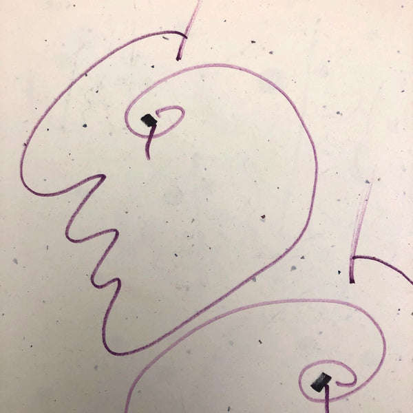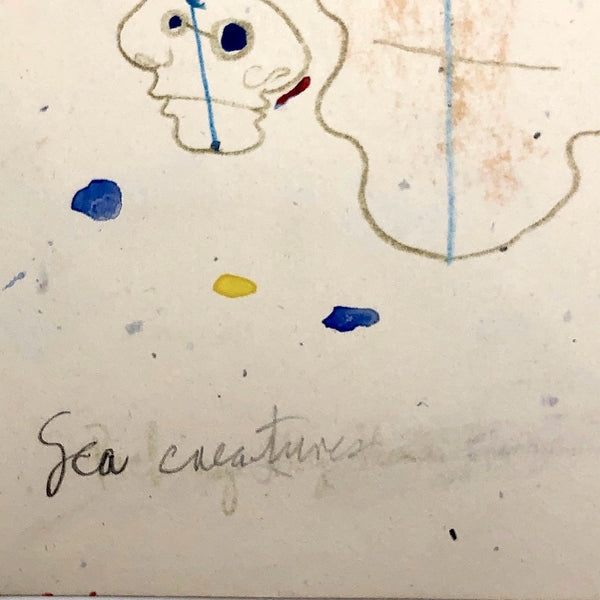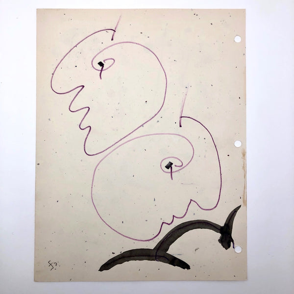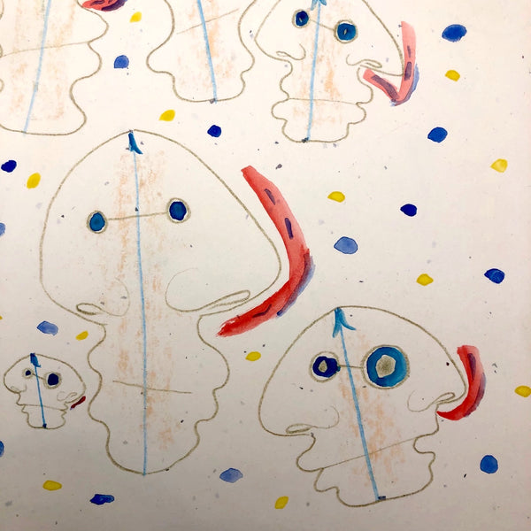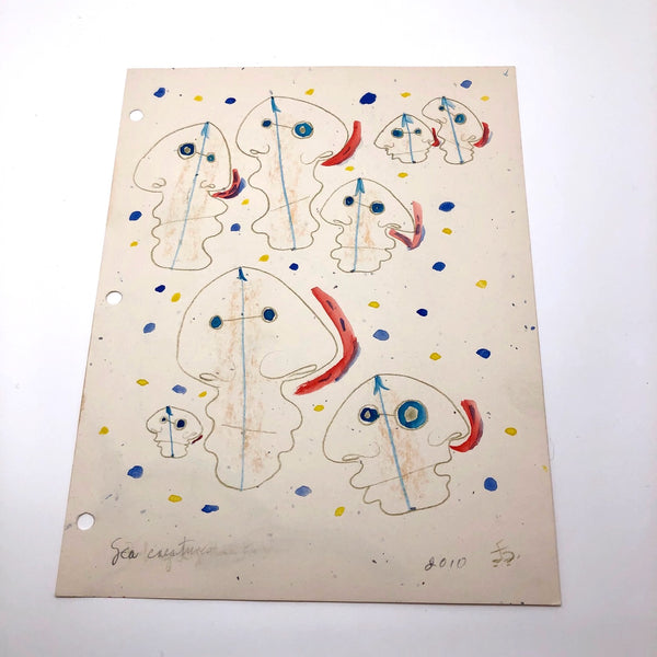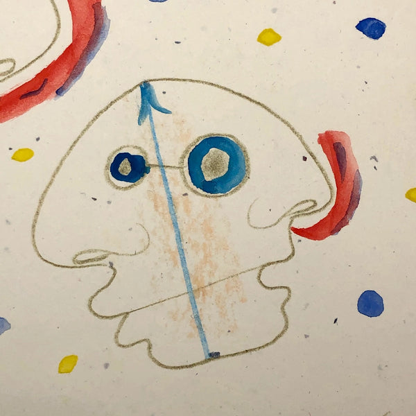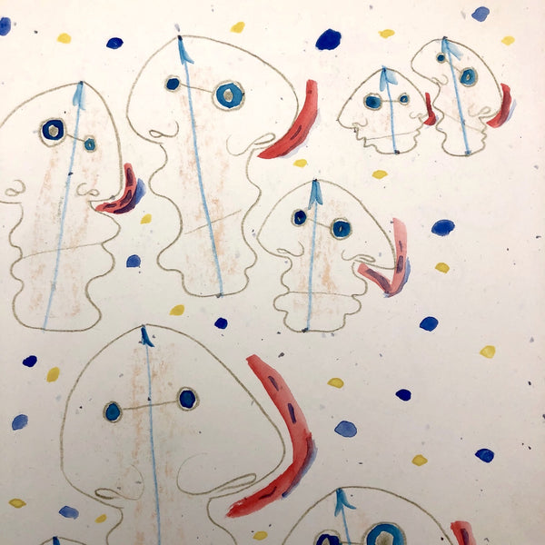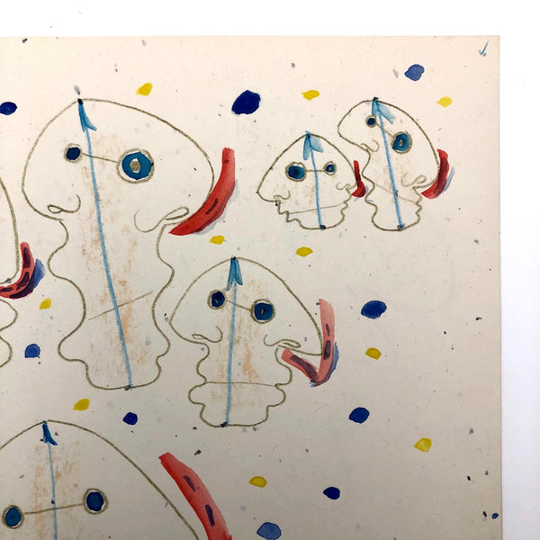 James Frederic Bone (1929-2015) a prolific and endlessly inventive Chicago artist, did a series of drawings very late in life of floating forms composed body-less facial profiles. Here the double-faced forms read as jellyfish, pulsing through a sea of blue and yellow painted dots. Blue upward-pointing arrows at the top of each head, horizontal pencil lines connecting the eyeballs, and red lines rising from nostrils together convey constant motion and circulation in all directions. At the center of each form is a subtle flesh color, almost like rubbing done against a lightly textured surface.