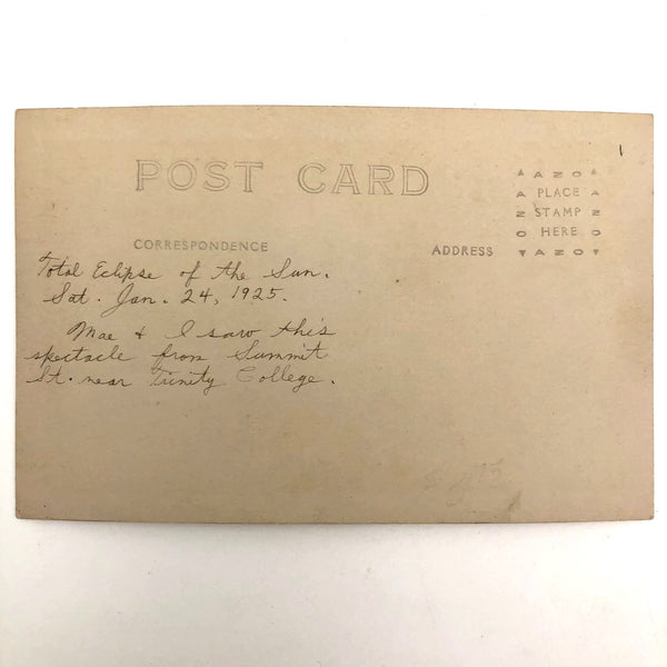 I do believe it was Summit Street in Hartford, Connecticut from which this view of the 1925 total solar eclipse was captured, as there is a Summit street near Trinity College, as the sender describes, who shared the special moment with her friend Mae. A striking image, and I just really love that photo postcards were used to share astronomical phenomenon such as this.