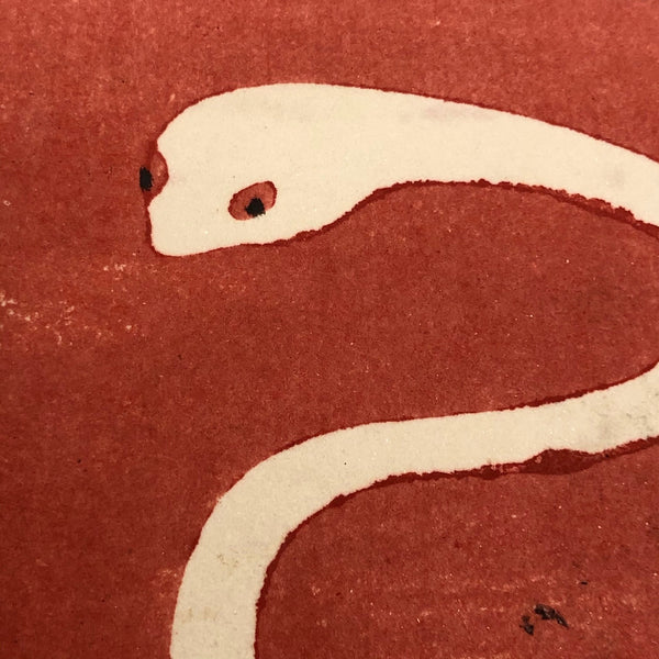 This is one of three woodblock postcards I purchased from a seller in Japan, each one welcoming a new year in the zodiac, this one I believe 1941, the year of the snake--and what a beautiful thing! According to the Japanese zodiac, those born in the year of the snake are deep thinkers, speak very little. possess tremendous wisdom, and are fortunate in money matters and will always be able to obtain it--so I'd say whether born in the year of the snake or not, a good symbol to adopt!