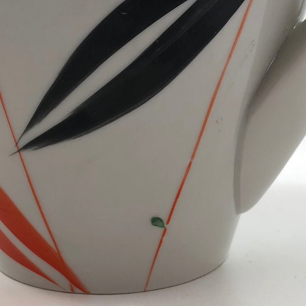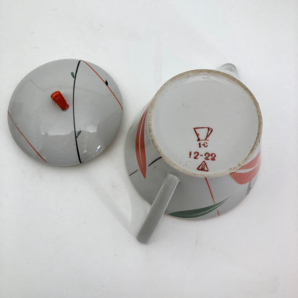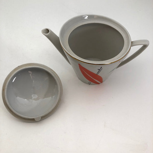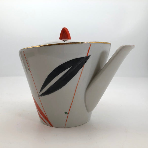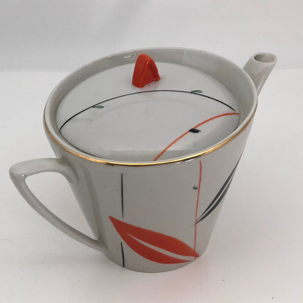 There is no end of great teapots out there; I have to stop myself from accumulating too many. But this one needed to be had! It's in terrific condition, and I love everything about it, from the triangular orange topper on the lid, to the jauntily cocked handle, to the gold rim around the top, to the bold orange and black leaf design, wonderfully enhanced with tiny green leaves here and there, making for little surprises.