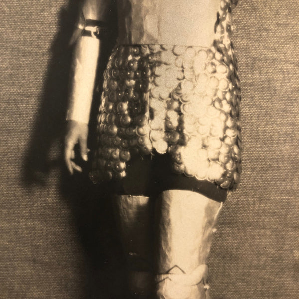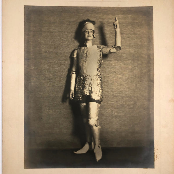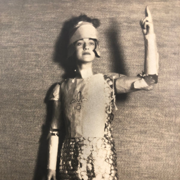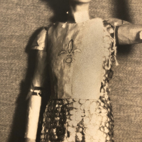 I love this photograph so much--for the make-shift nature of the costume, with brown paper shield bearing a hand-drawn fleur-de-lys and peter pan looking boots, but especially for the way this regal and poised young woman seems to transcend it, looking like a true reincarnation of Joan of Arc! Perfect shadows, perfect grainy backdrop, and to my eye so evocative--a real heroine!