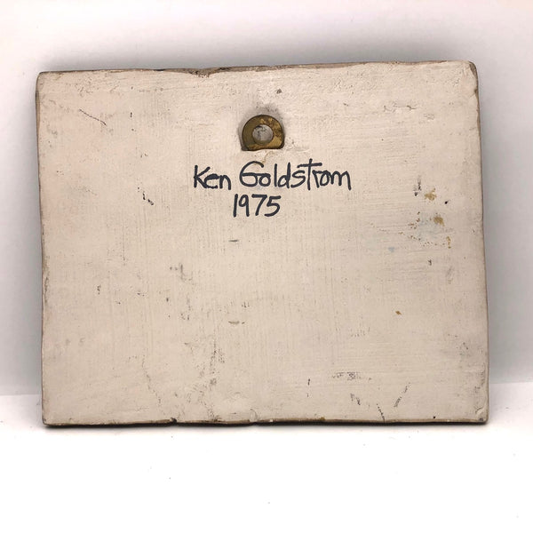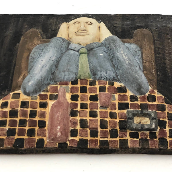 This is one of three hand-painted vintage 1970s ceramic tiles by Ken Goldstrom that I just found in Maine, and which I think are just right and just terrific. Based in Beverly, MA, Goldstrom has been creating small scale ceramic sculpture and tiles in a similar manner for many decades (unbeknownst to me until now), which he describes as "typically playful, sometimes whimsical, sometimes dark." In this one, our man seems a bit at the end of his rope, hands over ears as if to block out the sounds of the world, with the aid of the bottle of wine and cigarettes before him on this fabulously checkerboard painted table.