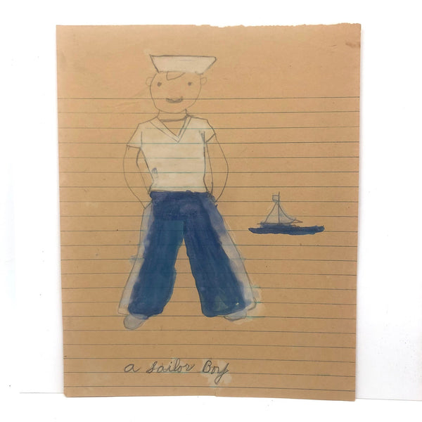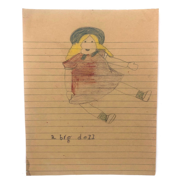 These from a group of seven I purchased by the same young maker, done in the 1930s or so I believe. The handwritten titles are a good part of what I love about them, lending a sort of iconic aspect to the figures depicted, perfectly complimented by the color block watercoloring on three of the four. The fourth, crayoned, is my particular favorite, with this "big doll" about as empathetic and animate as a doll could be.