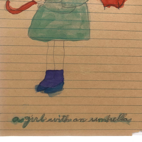 9 7/8" x 8" ea. Graphite and waterolor (or crayon) on lined paper, blank on reverse. Good condition, with a few losses around the bottom right corner of the umbrella girl. SOLD INDIVIDUALLY - please indicate in the notes field at checkout which you would like or add 2 to your cart for the pair.