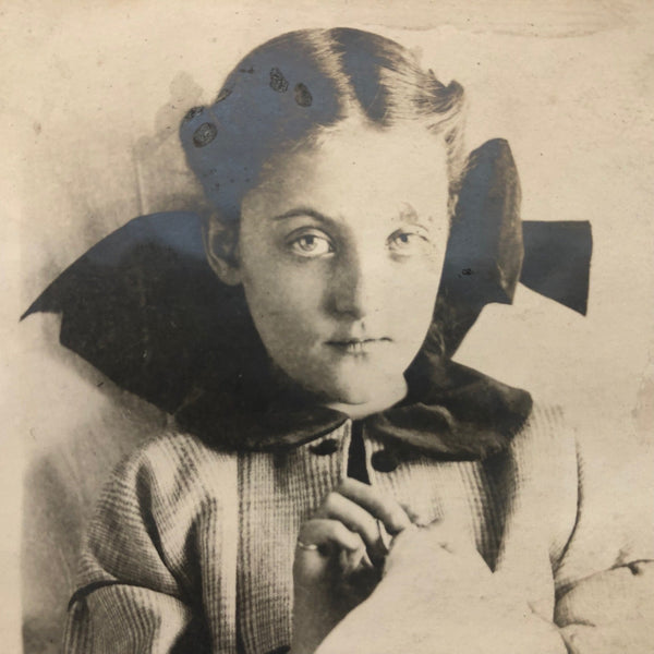 Knowing (and Rather Vampiric) Looking Girl Sewing, Antique Photo