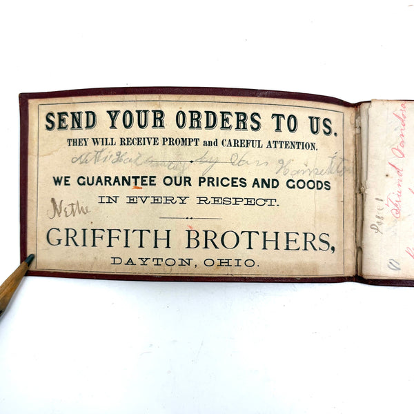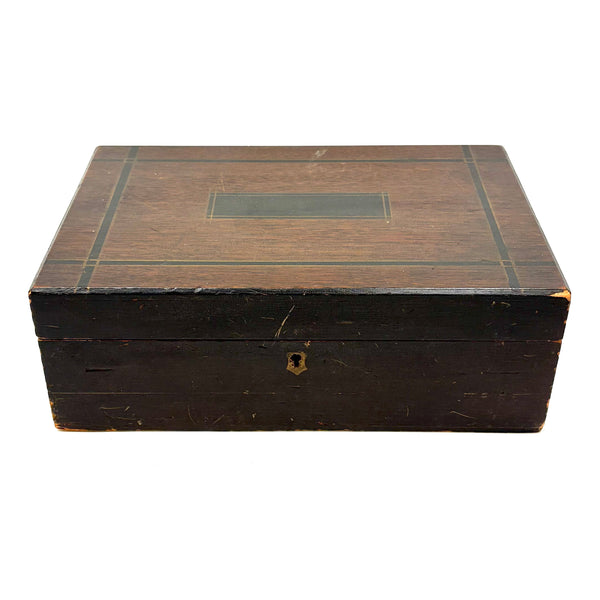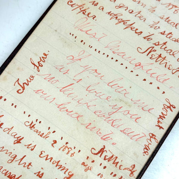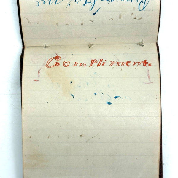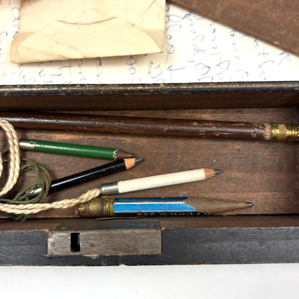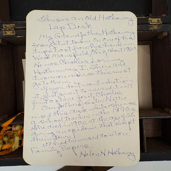 Lap desk: 11 1/2" x 7 7/8" x 4". Notebook 5 1/4" x 2 7/8", 23 pages plus two partial. Some filled front and back, some just front. Photos documents most pages. All in very good condition, as documented.