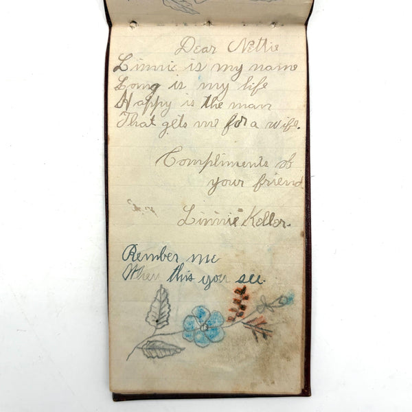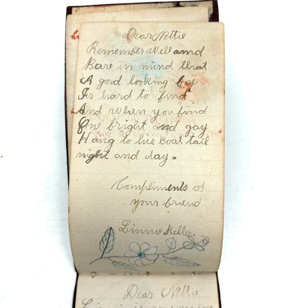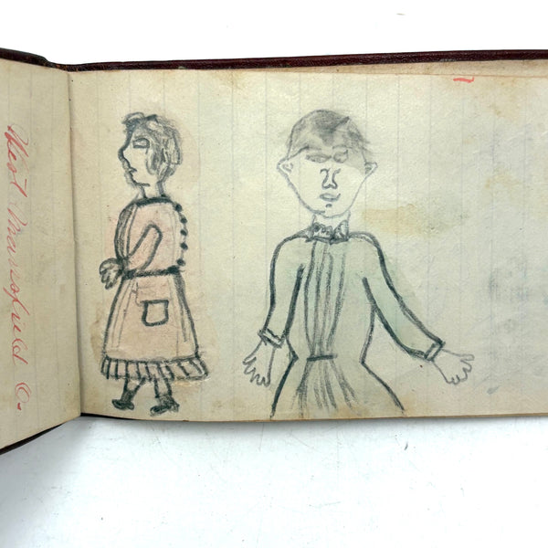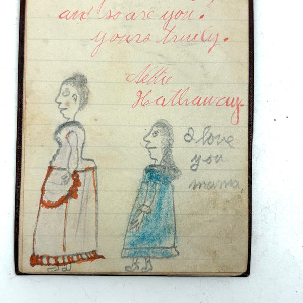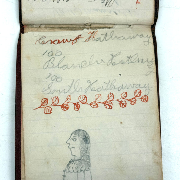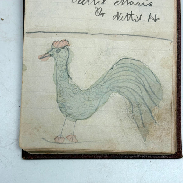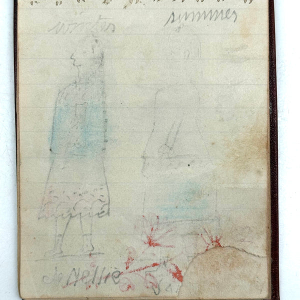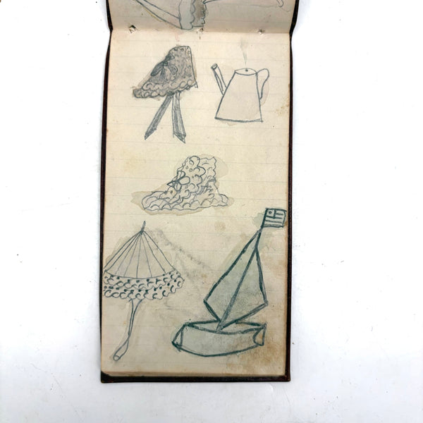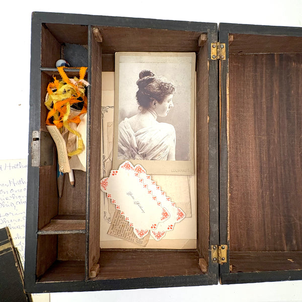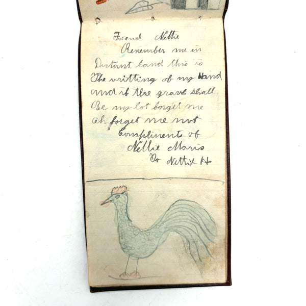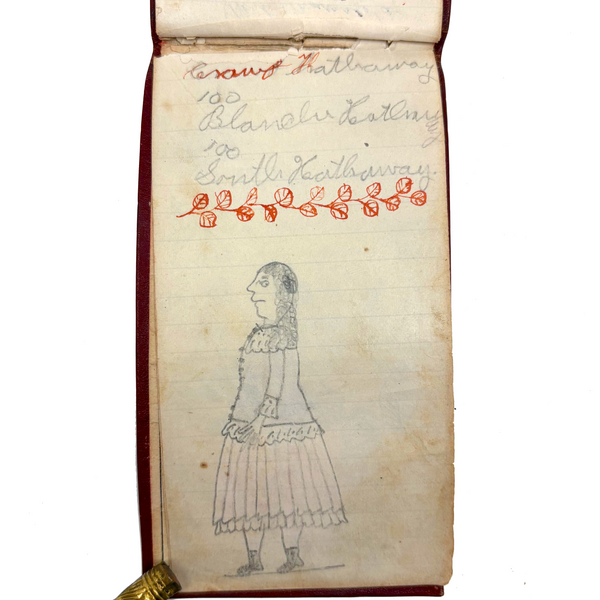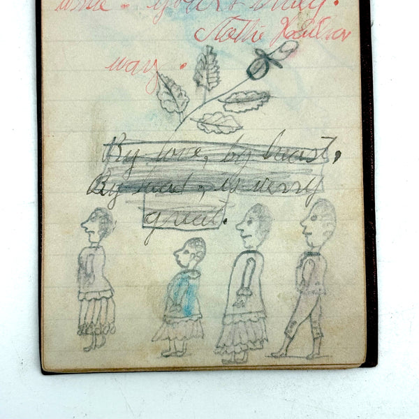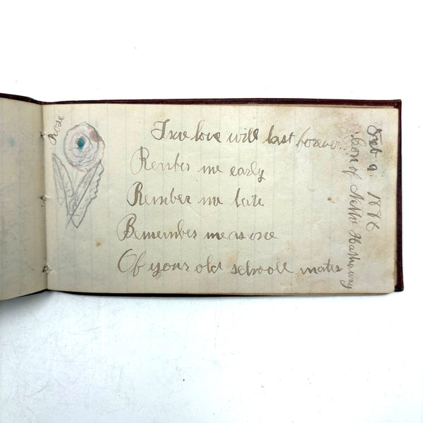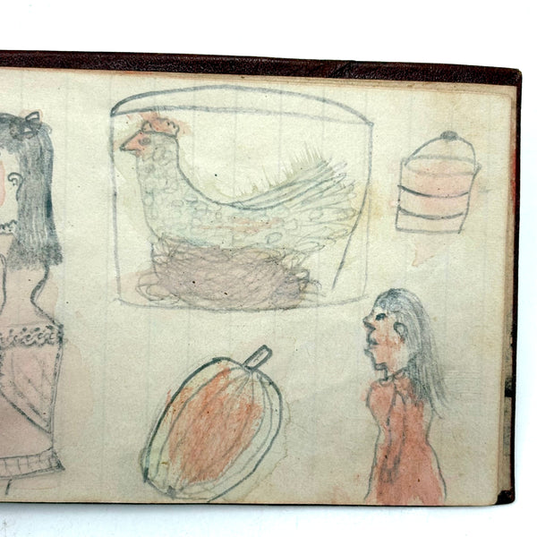 This one made me really happy to find, particularly the little notebook, with drawings that are right up my alley, but it feels especially special in the context of the rest of the content of the box. All were the possessions of Nettie Hathaway (1876-1902) of West Mansfield, Ohio, who was a school teacher before her early death at 26 from an unidentified epidemic that swept through their town. Included are a lovely cabinet card of the lovely young Nettie, age 20; a hand-written note from descendent Helen Hathaway describing its provenance; her teaching certification dated 1899; a few pencils and pen nibs and ribbons and bits of ephemera; and, best, this notebook from when she was 8-10, 1884-86, including some wonderful naive graphite and watercolor drawings mixed with some verses written by herself and friends and other little gems (such as a page leaded "Love Must Be" followed by tallies of "turned down" and "missed". !!?? I've documented it pretty comprehensively for posterity, though it is small and my photos not great. All held neatly in the antique wooden lap desk, just as found.