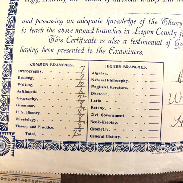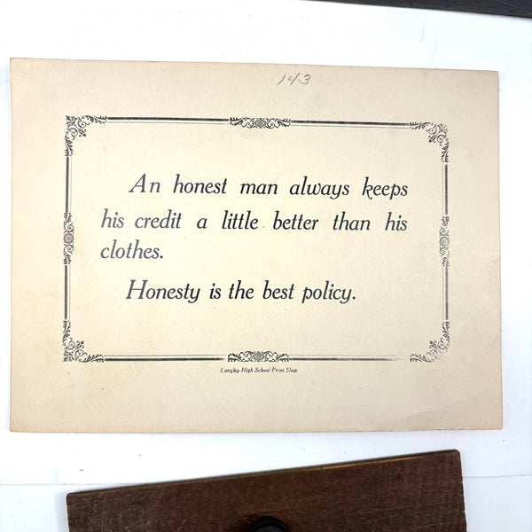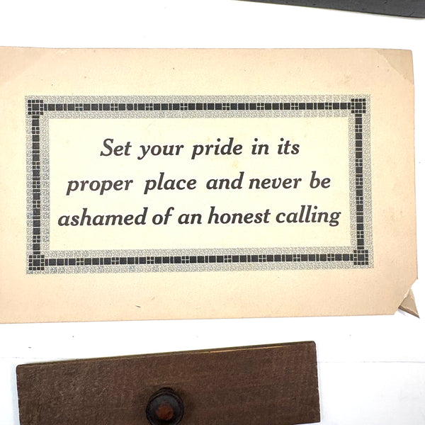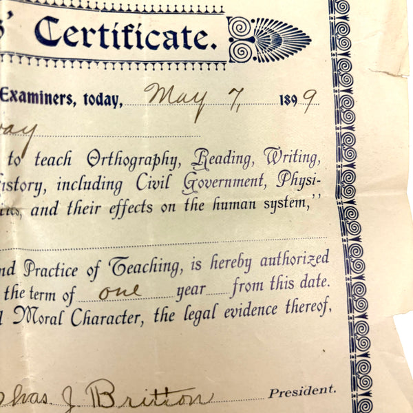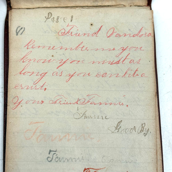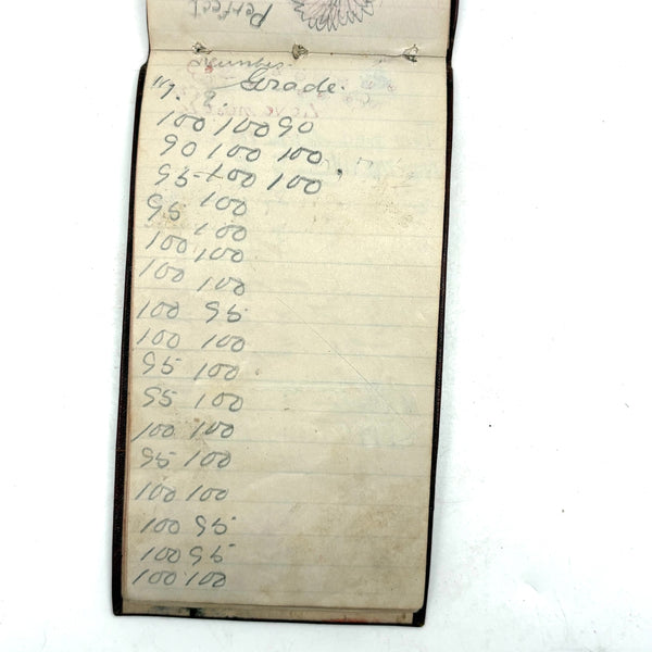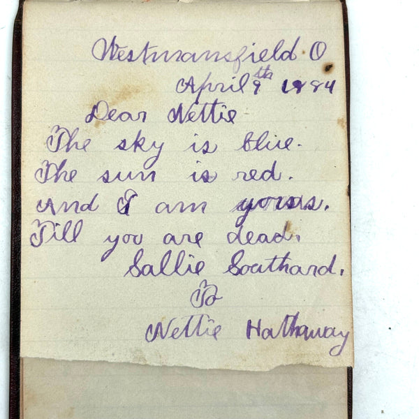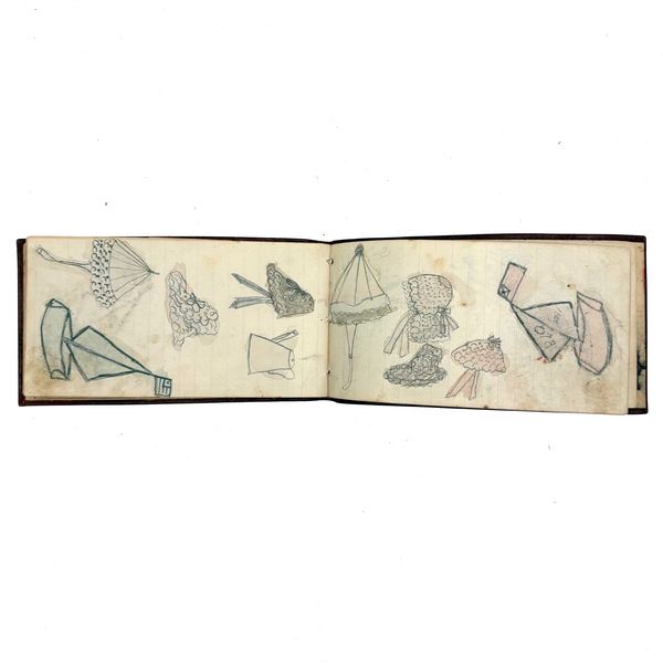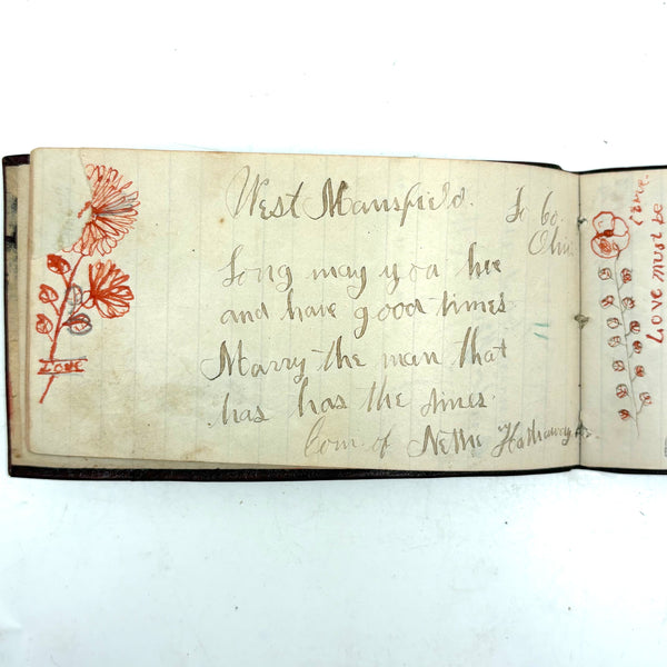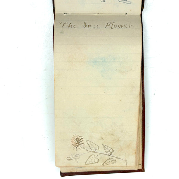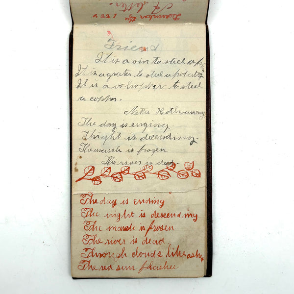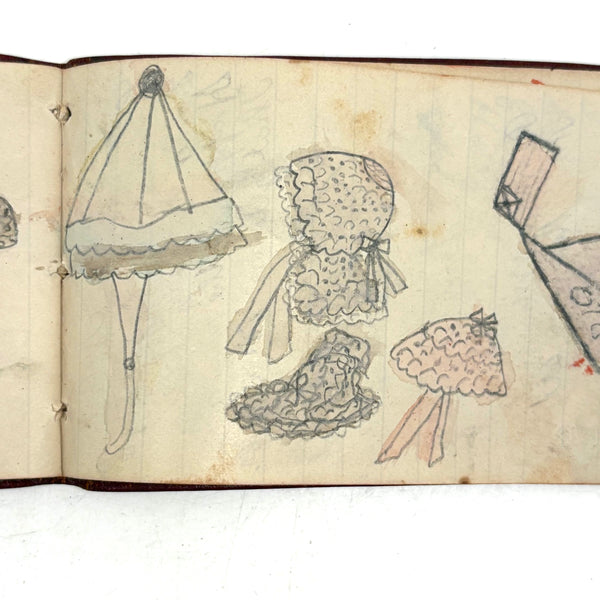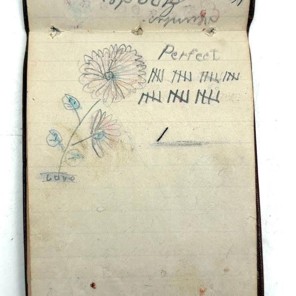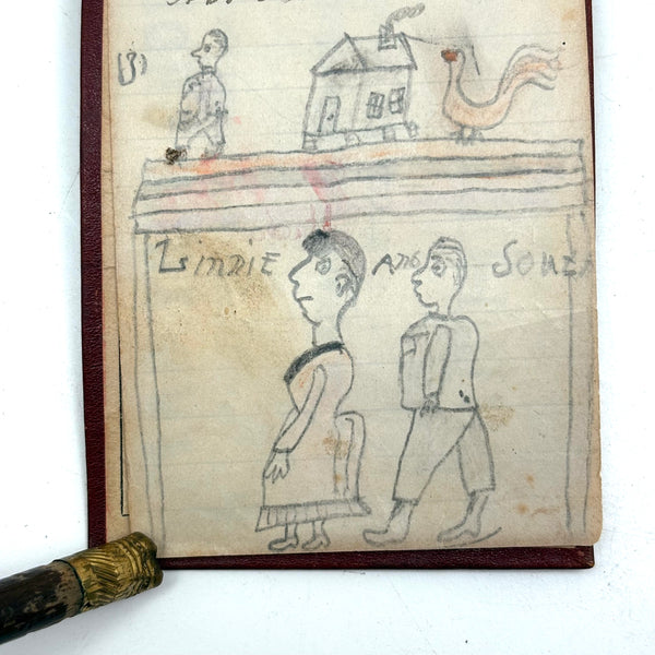 This one made me really happy to find, particularly the little notebook, with drawings that are right up my alley, but it feels especially special in the context of the rest of the content of the box. All were the possessions of Nettie Hathaway (1876-1902) of West Mansfield, Ohio, who was a school teacher before her early death at 26 from an unidentified epidemic that swept through their town. Included are a lovely cabinet card of the lovely young Nettie, age 20; a hand-written note from descendent Helen Hathaway describing its provenance; her teaching certification dated 1899; a few pencils and pen nibs and ribbons and bits of ephemera; and, best, this notebook from when she was 8-10, 1884-86, including some wonderful naive graphite and watercolor drawings mixed with some verses written by herself and friends and other little gems (such as a page leaded "Love Must Be" followed by tallies of "turned down" and "missed". !!?? I've documented it pretty comprehensively for posterity, though it is small and my photos not great. All held neatly in the antique wooden lap desk, just as found.