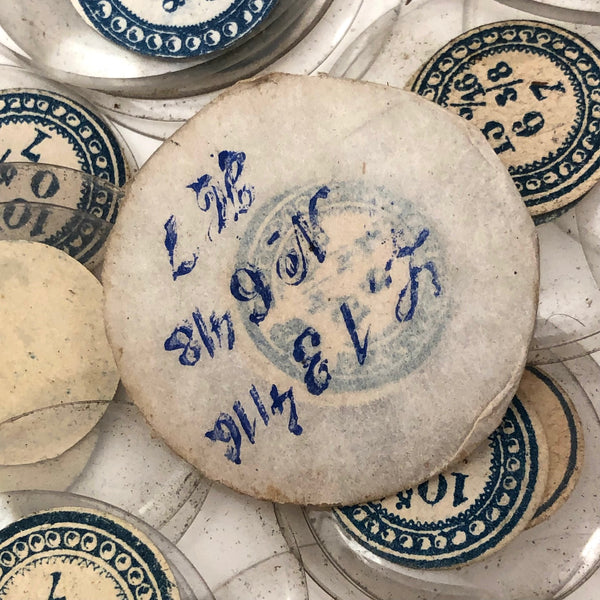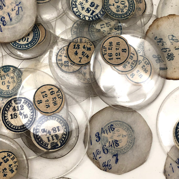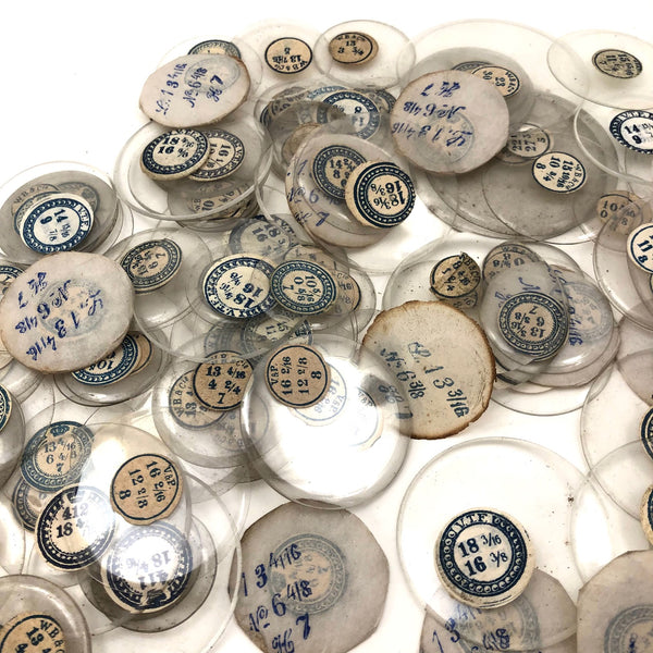 I just find these old glass watch crystals pretty things, especially their labels, and thought surely someone would have creative use for them. The lost includes exactly what you see, with the crystals ranging from in size as indicated by the labels. All appear to be French and a handful are still wrapped in paper, with dimensions printed in blue on the paper. The glass itself shows some dust, but there are no cracks or chips that I can see.