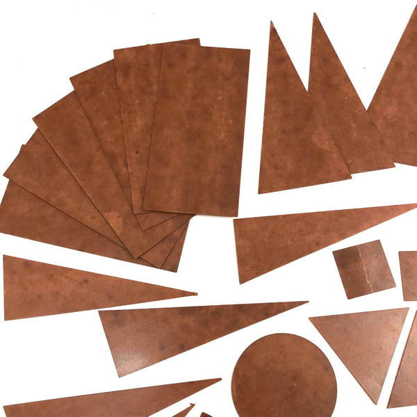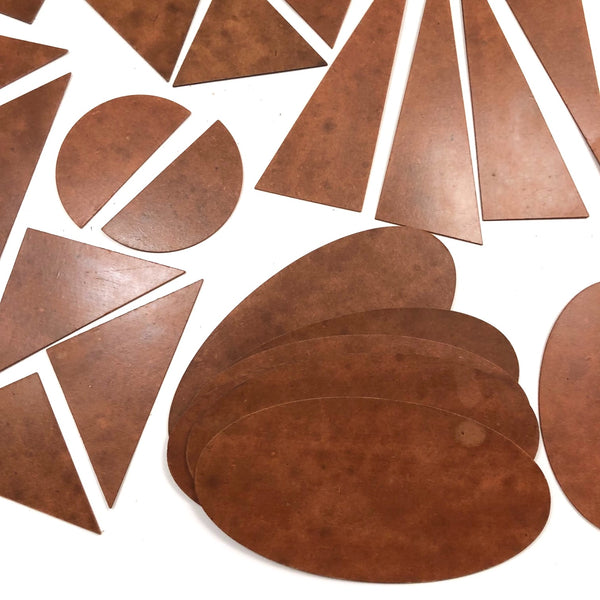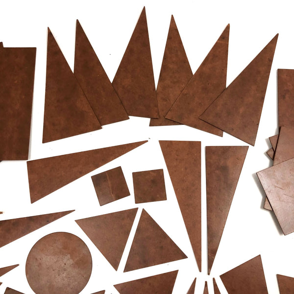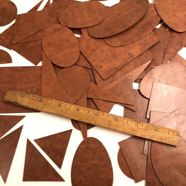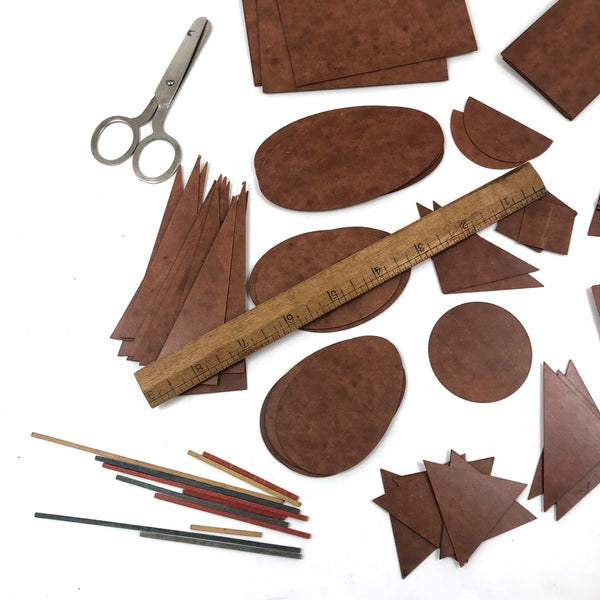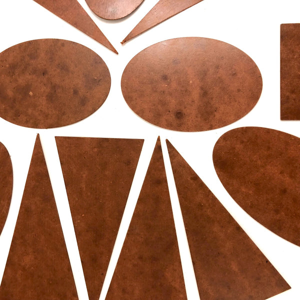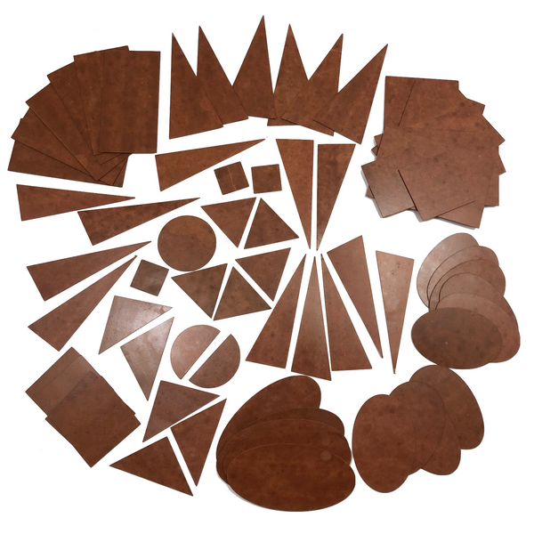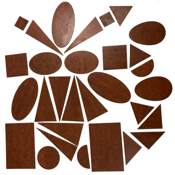 No geometric solids in this late 19th c. Prang's "Drawing Models" box, but nearly all of the flat "tablets" or flat cardboard shape templates are present, plus original ruler, scissors and a few colored sticks, too. I think these are interesting to play around with and use in all sorts of ways--as stencils but also as means of building patterns and compositions and just thinking visually. (Spreading them out and moving them around makes me at least feel very creative!) They are made of a hard, smooth, very durable cardboard, and feel very Froebel-ian.