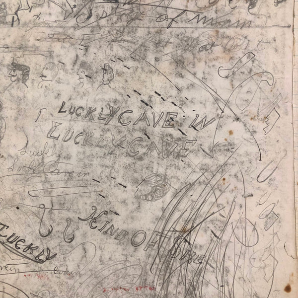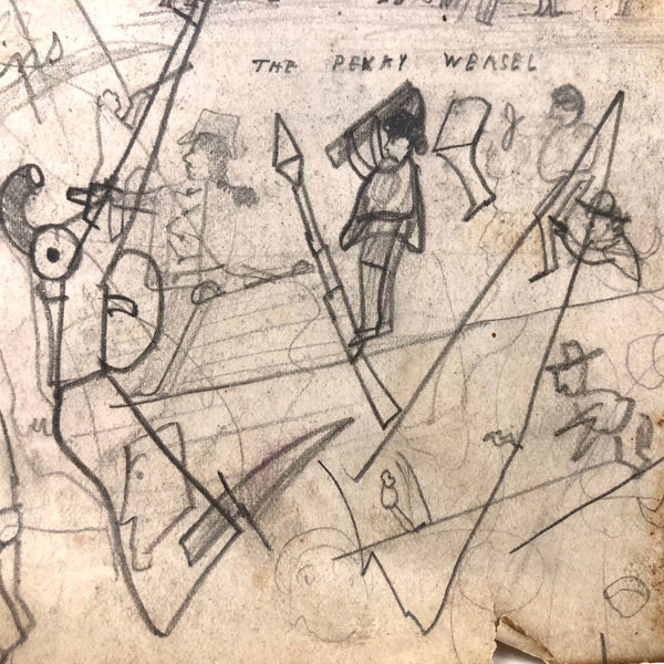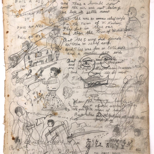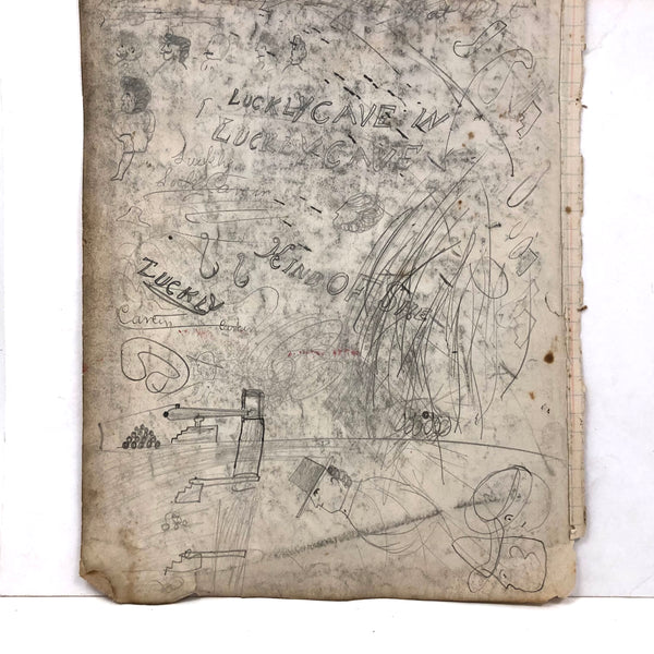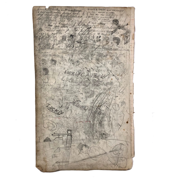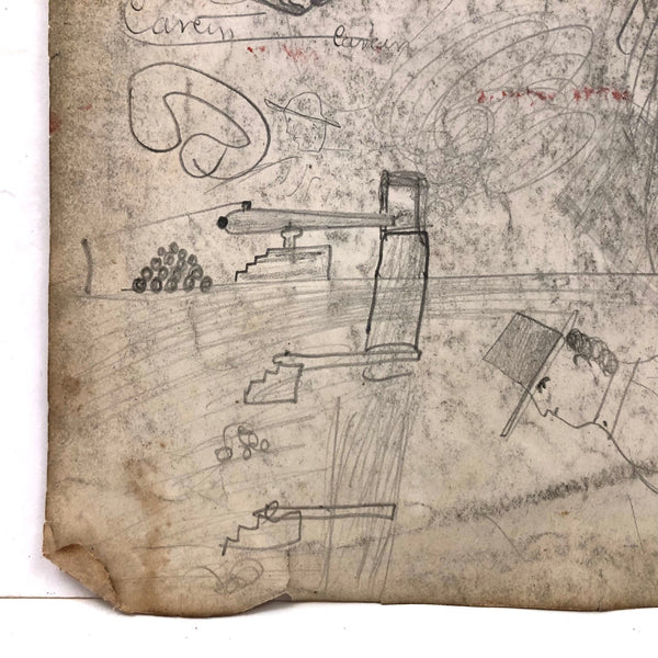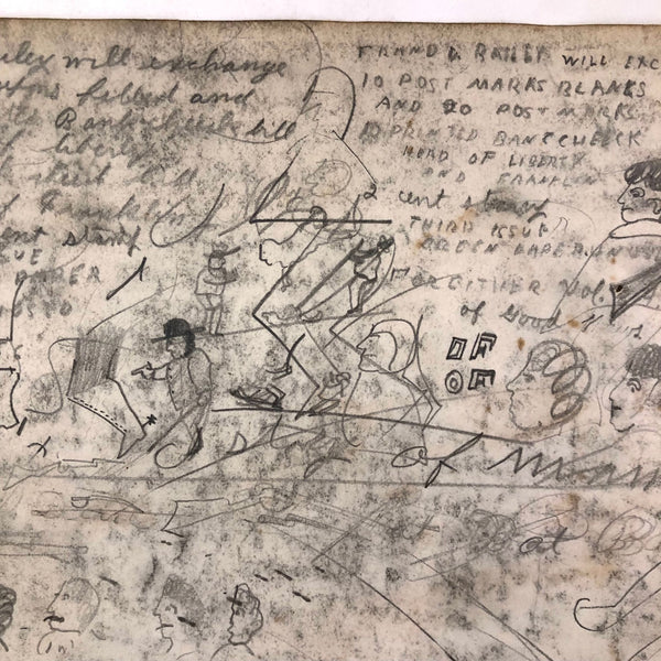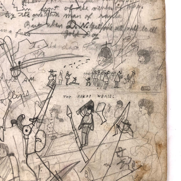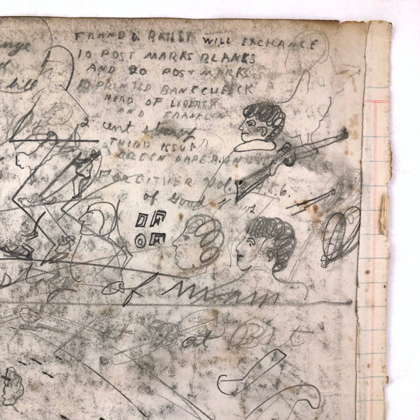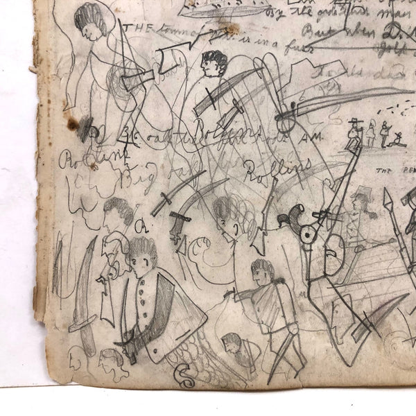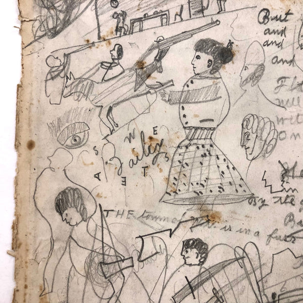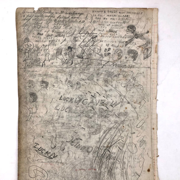 A couple more today from the same late 19th c. ledger as a few pages I listed a few weeks ago--which had come loose from the bulk of it (which I also have, every page filled with hand-written stories interrupted throughout with little sketches akin to these; I want to spend a little time reading it before parting with it, but if interested, let me know!) These densely doodled end pages are the best though--pure visual stream of consciousness delights, and revealing more and more the more one looks. I am forever opening books and notebooks in hopes of finding end pages just like this.