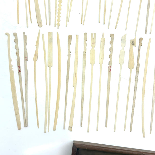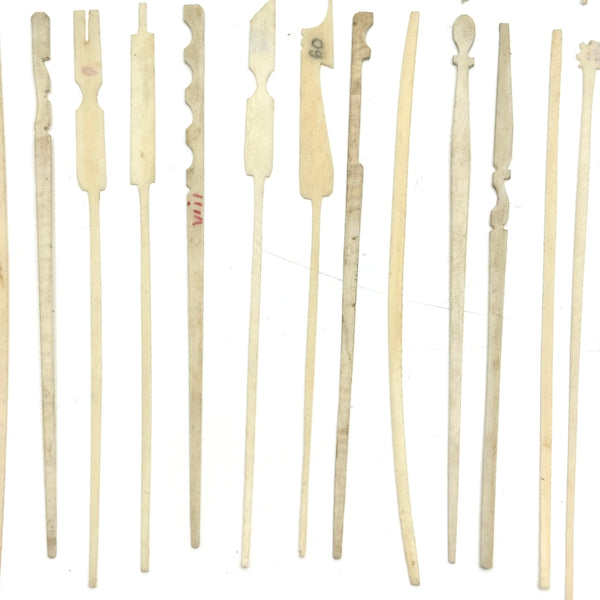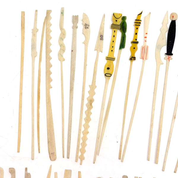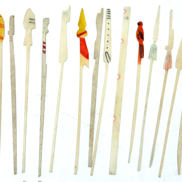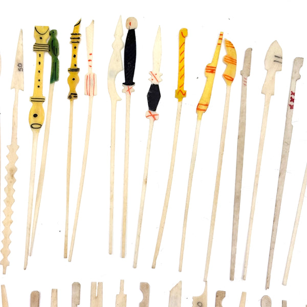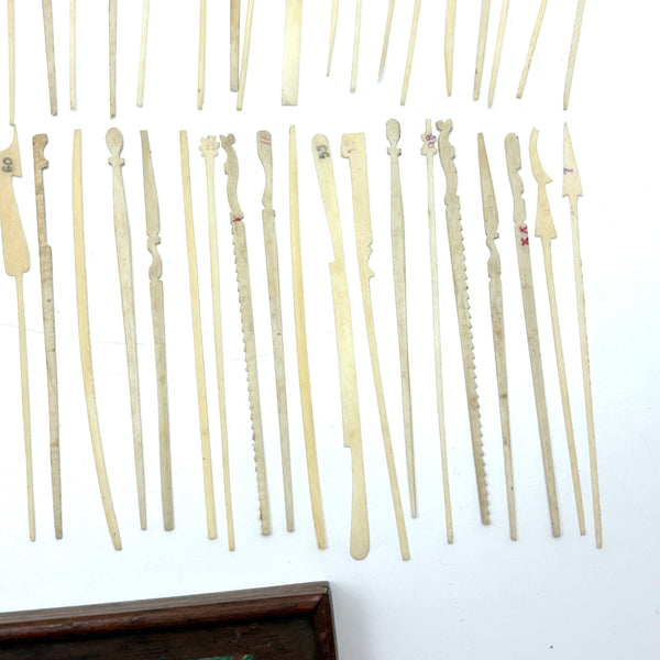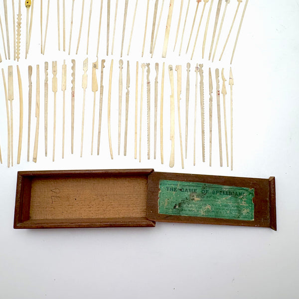 A nice, quite abundant set of antique bone spellicans, 1880s or so, in original box, with a good handful of them with hand-painted details, mostly lending swords colorful handles, but also a few birds. I believe there are pieces for a few different sets here (as is often the case), as the point values appear in handwritten red ink on some and dark ink on others. With a bone hook included among them too. I'll never stop being drawn to sets of these, I just think they're so lovely and special feeling. (And I do currently have another boxless set of about 40 I've not listed; if interested, just let me know.) Played like pick up sticks.