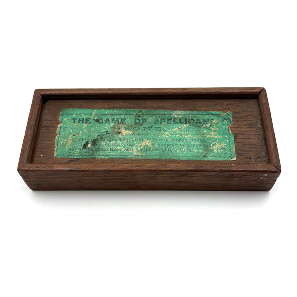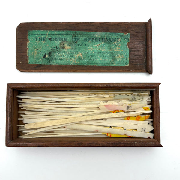Box measures 4 3/4" x 1 7/8" x 7/8". Wear to the green paper label as evident, but otherwise box and spellicans all in very good antique condition.