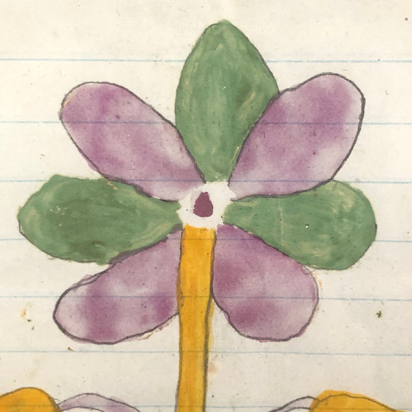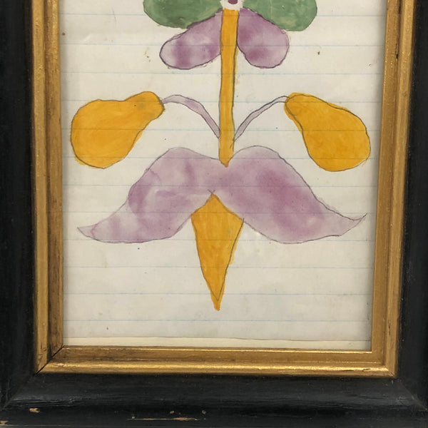 Of all the things found in the last two weeks, this one feels to me the dearest at the moment. 19th century, likely done by a school girl, probably in Pennsylvania, watercolor on lined paper. A flower that also looks like a figure wearing a skirt, with ochre leaves looking both like pears and like boxing gloves, and a pointed end, roots, like a carrot, or a blade, or a ballerina on point. Looks a bit like an ice cream cone too. Layers of life and blooming.