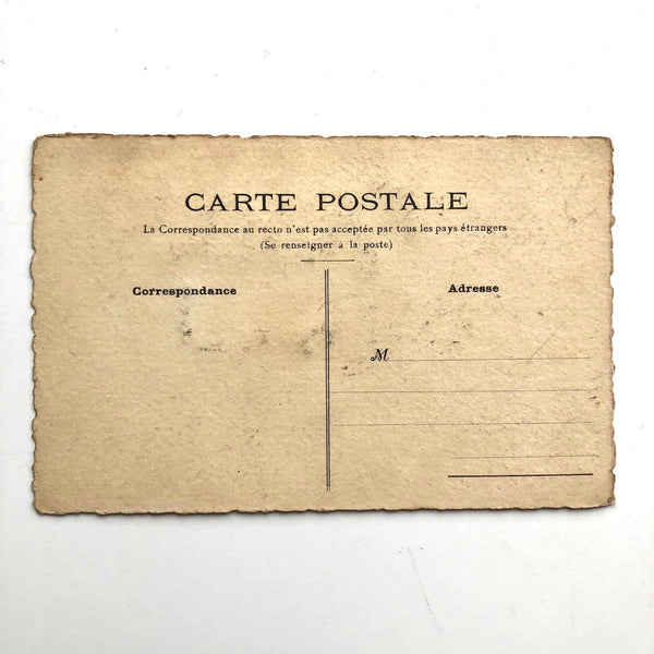 The title at the top right of this earlyish 20th century handmade postcard suggests that there were at least three other dog-man iterations, which makes me wonder about the other scenarios! I'd think the long coat in this one is about to be closed in order to make it look like the boy has a dog head, with just the bottom of his stamp-collaged shorts and ink-drawn shoes peeking out below. I especially love this little bit of reddish stamp giving the hat of the boy at right a little pompom. Very French!