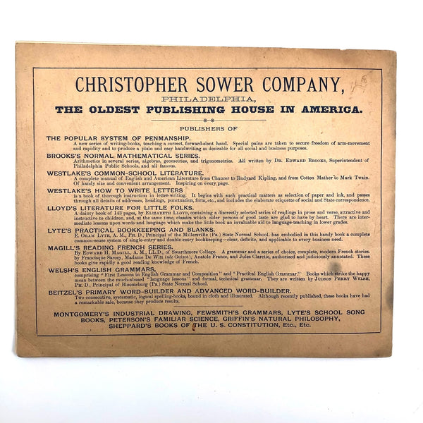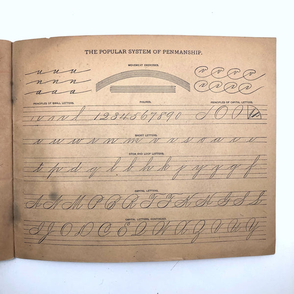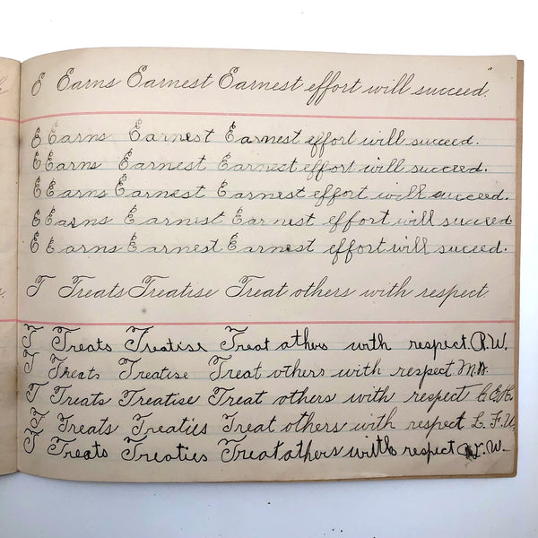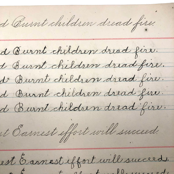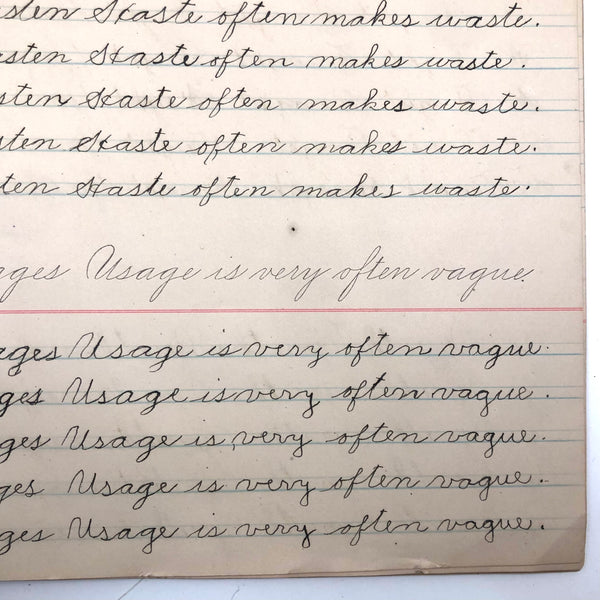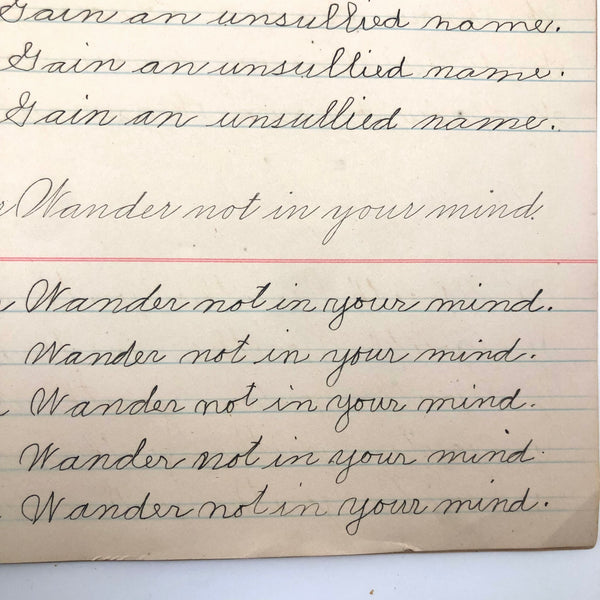 As you likely know by now, I've a special weakness for penmanship practice notebooks of all sorts, for all different sorts of reasons, high among them being the specific words and phrases chosen for repetition, which take on added resonance for being written over and over again (and also tell us a lot about the times, including the values being stealthily drilled into children! ) This one, published in 1899, struck me first for the sentence "Burnt children dread fire," seeming quite macabre now, but surely not so much in the early days of electricity. Others seem quite of the moment: "Fight the battle for truth," "Usage is very often vague"...and then, my favorite page, near the end, which I would frame: "Wander not in your mind" repeated just once, followed by two wanders, then our girl Lila Wise's mind happily, defiantly, wandered off!