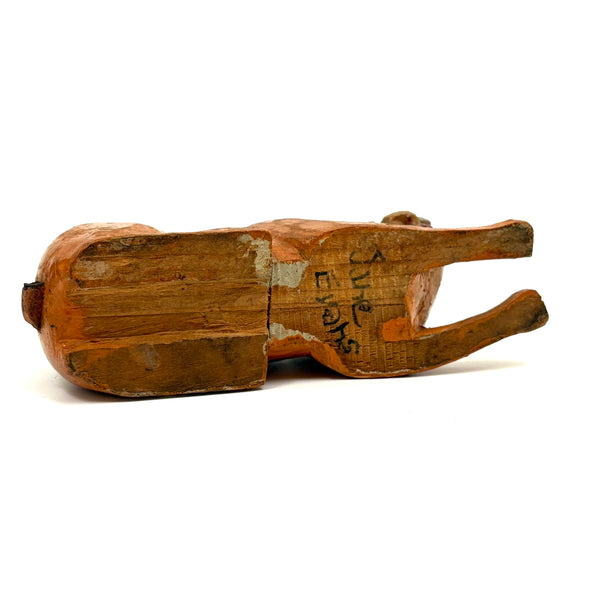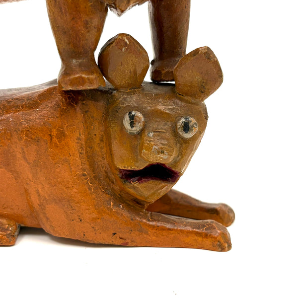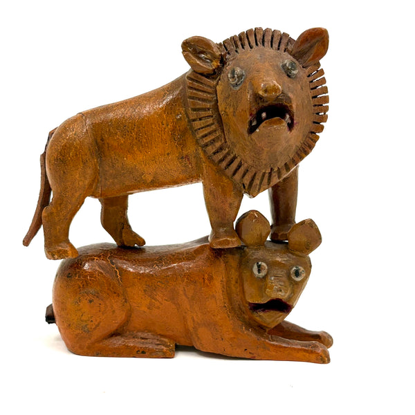 The most excellent and full of life and roar carved and stained lion and lioness--who have made it thus far together, so together they must remain. The lioness is signed on the underside, looks like Jane Evans to me. The lion shows one repair to the tail and maybe to the right rear haunch (there is a carved incision, though seems it might be original to the making). Who cares, they are fabulous!