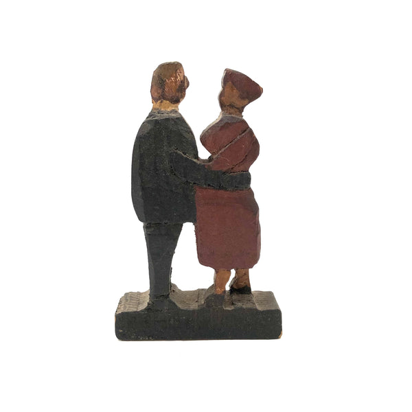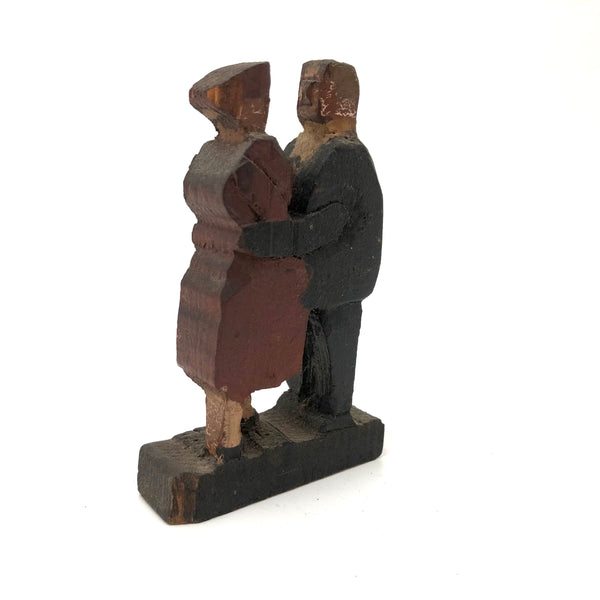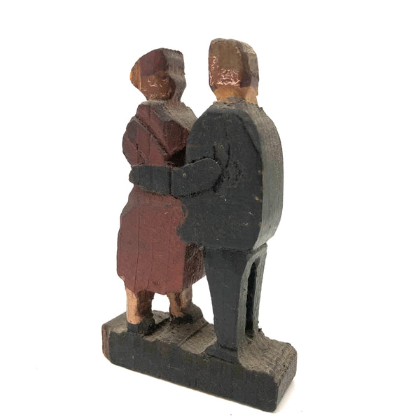 Just a little one, but I love these two so much, his arms forever grasping her waist, and her face forever raised toward his. With just the right amount of detailing--the raised outlining of each of their arms as they hold one another--placing all emphasis on that gesture. In nicely aged paint, some alligatoring to the paint on their faces. Very sweet but not the least bit saccharine.