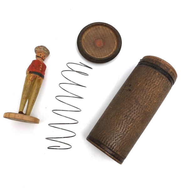 I'm not entirely sure whether this toy was created as I found it, or a one off creation of creative maker who combined treen canister, spring, and little man; I think likely the former--a genie in a box--but am not completely sure as I can't find another example out there like it. At any rate, the lid is threaded, and when you screw it off, up and out he springs! I believe most likely German Erzgebirge, and definitely with a good amount of age. One could also change him out with other figures for added excitement!