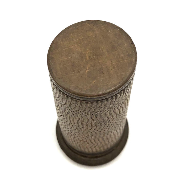 Treen canister measures 3" t x 1 3/8" d. All in very good condition, and quite a surprise when opened!
