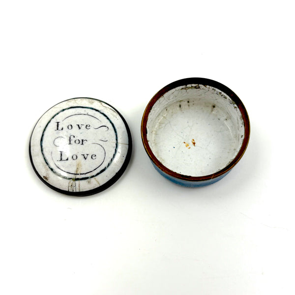 I'm always eyeing late 18th century Bilston/Battersea enameled patch boxes, but mostly restrain myself. The "Love for Love" on this one really won me though, for its simultaneous concision and expansiveness of meaning/ interpretation, and its universality at the end of the day. And the best cornflower blue too.